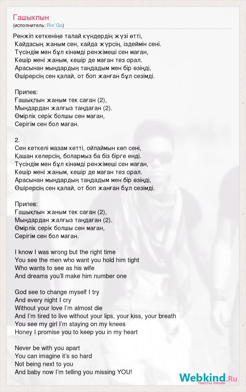 Ренжіп кеткеніңе талай күндердің жүзі өтті, Кайдасың жаным сен, кайда жүрсің, іздеймін сені. Түсіндім мен бұл кінәмді ренжімеші сен маған, Кешір мені жаным, кешір де маған тез орал. Арасынан мыңдардың таңдадым мен бір өзіңді, Өшірерсің сен қалай, от боп жанған бұл сезімді. Припев: Ғашықпын жаным тек саған (2), Мыңдардан жалғыз таңдаған (2). Өмірлік серік болшы сен маған, Серігім сен бол маған. 2. Сен кеткелі мазам кетті, ойлаймын көп сені, Қашан келерсің, болармыз ба біз бірге енді. Түсіндім мен бұл кінәмді ренжімеші сен маған, Кешір мені жаным, кешір де маған тез орал. Арасынан мыңдардың таңдадым мен бір өзіңді, Өшірерсің сен қалай, от боп жанған бұл сезімді. Припев: Ғашықпын жаным тек саған (2), Мыңдардан жалғыз таңдаған (2). Өмірлік серік болшы сен маған, Серігім сен бол маған. I know I was wrong but the right time You see the men who want you hold him tight Who wants to see as his wife And dreams you’ll make him number one God see to change myself I try And every night I cry Without your love I’m almost die And I’m tired to live without your lips, your kiss, your breath You see my girl I’m staying on my knees Honey I promise you to keep you in my heart Never be with you apart You can imagine it’s so hard Not being next to you And baby now I’m telling you missing YOU!