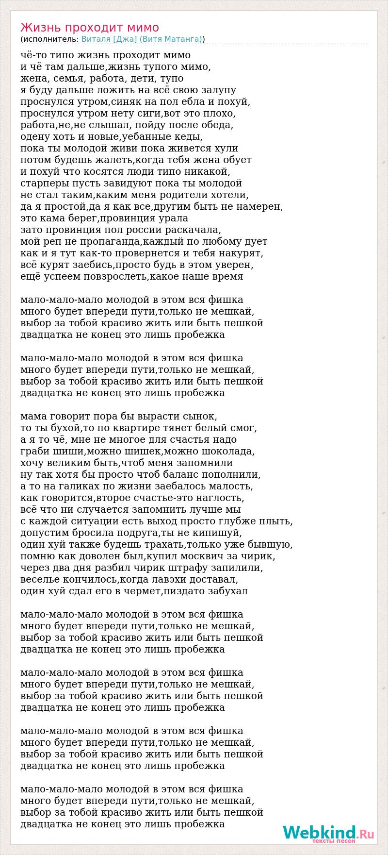 чё-то типо жизнь проходит мимо и чё там дальше,жизнь тупого мимо, жена, семья, работа, дети, тупо я буду дальше ложить на всё свою залупу проснулся утром,синяк на пол ебла и похуй, проснулся утром нету сиги,вот это плохо, работа,не,не слышал, пойду после обеда, одену хоть и новые,уебанные кеды, пока ты молодой живи пока живется хули потом будешь жалеть,когда тебя жена обует и похуй что косятся люди типо никакой, старперы пусть завидуют пока ты молодой не стал таким,каким меня родители хотели, да я простой,да я как все,другим быть не намерен, это кама берег,провинция урала зато провинция пол россии раскачала, мой реп не пропаганда,каждый по любому дует как и я тут как-то провернется и тебя накурят, всё курят заебись,просто будь в этом уверен, ещё успеем повзрослеть,какое наше время мало-мало-мало молодой в этом вся фишка много будет впереди пути,только не мешкай, выбор за тобой красиво жить или быть пешкой двадцатка не конец это лишь пробежка мало-мало-мало молодой в этом вся фишка много будет впереди пути,только не мешкай, выбор за тобой красиво жить или быть пешкой двадцатка не конец это лишь пробежка мама говорит пора бы вырасти сынок, то ты бухой,то по квартире тянет белый смог, а я то чё, мне не многое для счастья надо граби шиши,можно шишек,можно шоколада, хочу великим быть,чтоб меня запомнили ну так хотя бы просто чтоб баланс пополнили, а то на галиках по жизни заебалось малость, как говорится,второе счастье-это наглость, всё что ни случается запомнить лучше мы с каждой ситуации есть выход просто глубже плыть, допустим бросила подруга,ты не кипишуй, один хуй также будешь трахать,только уже бывшую, помню как доволен был,купил москвич за чирик, через два дня разбил чирик штрафу запилили, веселье кончилось,когда лавэхи доставал, один хуй сдал его в чермет,пиздато забухал мало-мало-мало молодой в этом вся фишка много будет впереди пути,только не мешкай, выбор за тобой красиво жить или быть пешкой двадцатка не конец это лишь пробежка мало-мало-мало молодой в этом вся фишка много будет впереди пути,только не мешкай, выбор за тобой красиво жить или быть пешкой двадцатка не конец это лишь пробежка мало-мало-мало молодой в этом вся фишка много будет впереди пути,только не мешкай, выбор за тобой красиво жить или быть пешкой двадцатка не конец это лишь пробежка мало-мало-мало молодой в этом вся фишка много будет впереди пути,только не мешкай, выбор за тобой красиво жить или быть пешкой двадцатка не конец это лишь пробежка