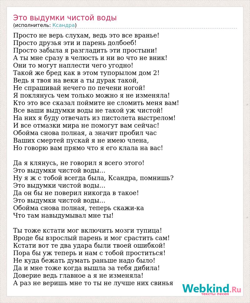 Просто не верь слухам, ведь это все вранье! Просто друзья эти и парень долбоеб! Просто забыла я разгладить эти простыни! А ты мне сразу в челюсть и ни во что не вник! Они то могут наплести чего угодно! Такой же бред как в этом тупорылом дом 2! Ведь я твоя на веки а ты дурак такой, Не спрашивай нечего по печени ногой! Я поклянусь чем только можно я не изменяла! Кто это все сказал поймите не сломить меня вам! Все ваши выдумки воды не такой уж чистой! На них я буду отвечать из пистолета выстрелом! И все отмазки мира не помогут вам сейчас! Обойма снова полная, а значит пробил час Ваших смертей пускай я не имею члена, Но говорю вам прямо что я его клала на вас! Да я клянусь, не говорил я всего этого! Это выдумки чистой воды… Ну я ж с тобой всегда была, Ксандра, помнишь? Это выдумки чистой воды… Да он бы не поверил никогда в такое! Это выдумки чистой воды… Обойма снова полная, теперь скажи-ка Что там навыдумывал мне ты! Ты тоже кстати мог включить мозги тупица! Вроде бы взрослый парень и мог срастить сам! Кстати вот те два удара были твоей ошибкой! Пора бы уж теперь и нам с тобой проститься! Не куда бежать думать раньше надо было! Да и мне тоже когда вышла за тебя дибила! Доверие ведь главное а я не изменяла! А раз не веришь мне то ты не лучше них свинья