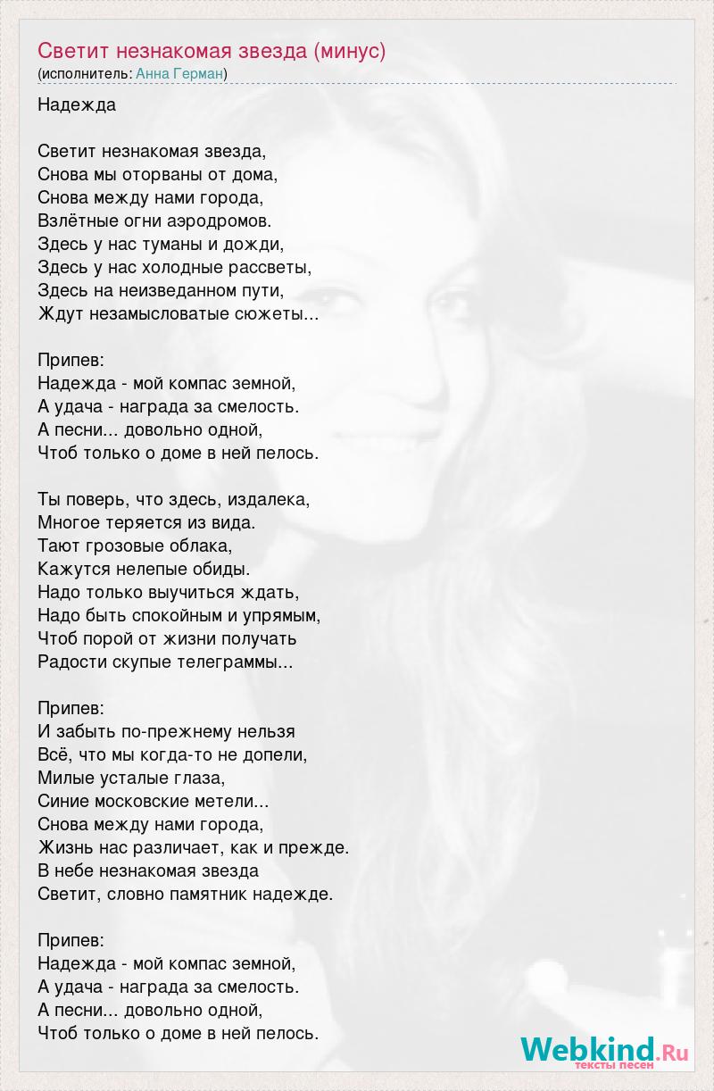 Надежда Светит незнакомая звезда, Снова мы оторваны от дома, Снова между нами города, Взлётные огни аэродромов. Здесь у нас туманы и дожди, Здесь у нас холодные рассветы, Здесь на неизведанном пути, Ждут незамысловатые сюжеты... Припев: Надежда - мой компас земной, А удача - награда за смелость. А песни... довольно одной, Чтоб только о доме в ней пелось. Ты поверь, что здесь, издалека, Многое теряется из вида. Тают грозовые облака, Кажутся нелепые обиды. Надо только выучиться ждать, Надо быть спокойным и упрямым, Чтоб порой от жизни получать Радости скупые телеграммы... Припев: И забыть по-прежнему нельзя Всё, что мы когда-то не допели, Милые усталые глаза, Синие московские метели... Снова между нами города, Жизнь нас различает, как и прежде. В небе незнакомая звезда Светит, словно памятник надежде. Припев: Надежда - мой компас земной, А удача - награда за смелость. А песни... довольно одной, Чтоб только о доме в ней пелось.