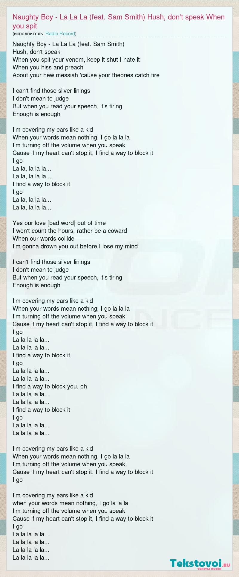 Naughty Boy - La La La (feat. Sam Smith) Hush, don't speak When you spit your venom, keep it shut I hate it When you hiss and preach About your new messiah 'cause your theories catch fire I can't find those silver linings I don't mean to judge But when you read your speech, it's tiring Enough is enough I'm covering my ears like a kid When your words mean nothing, I go la la la I'm turning off the volume when you speak Cause if my heart can't stop it, I find a way to block it I go La la, la la la... La la, la la la... I find a way to block it I go La la, la la la... La la, la la la... Yes our love is running out of time I won't count the hours, rather be a coward When our words collide I'm gonna drown you out before I lose my mind I can't find those silver linings I don't mean to judge But when you read your speech, it's tiring Enough is enough I'm covering my ears like a kid When your words mean nothing, I go la la la I'm turning off the volume when you speak Cause if my heart can't stop it, I find a way to block it I go La la la la la... La la la la la... I find a way to block it I go La la la la la... La la la la la... I find a way to block you, oh La la la la la... La la la la la... I find a way to block it I go La la la la la... La la la la la... I'm covering my ears like a kid When your words mean nothing, I go la la la I'm turning off the volume when you speak Cause if my heart can't stop it, I find a way to block it I go I'm covering my ears like a kid when your words mean nothing, I go la la la I'm turning off the volume when you speak Cause if my heart can't stop it, I find a way to block it I go La la la la la... La la la la la... La la la la la... La la la la la...