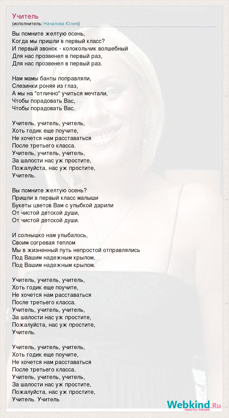 Вы помните желтую осень, Когда мы пришли в первый класс? И первый звонок - колокольчик волшебный Для нас прозвенел в первый раз, Для нас прозвенел в первый раз. Нам мамы банты поправляли, Слезинки роняя из глаз, А мы на "отлично" учиться мечтали, Чтобы порадовать Вас, Чтобы порадовать Вас. Учитель, учитель, учитель, Хоть годик еще поучите, Не хочется нам расставаться После третьего класса. Учитель, учитель, учитель, За шалости нас уж простите, Пожалуйста, нас уж простите, Учитель. Вы помните желтую осень? Пришли в первый класс малыши Букеты цветов Вам с улыбкой дарили От чистой детской души, От чистой детской души. И солнышко нам улыбалось, Своим согревая теплом Мы в жизненный путь непростой отправлялись Под Вашим надежным крылом, Под Вашим надежным крылом. Учитель, учитель, учитель, Хоть годик еще поучите, Не хочется нам расставаться После третьего класса. Учитель, учитель, учитель, За шалости нас уж простите, Пожалуйста, нас уж простите, Учитель. Учитель, учитель, учитель, Хоть годик еще поучите, Не хочется нам расставаться После третьего класса. Учитель, учитель, учитель, За шалости нас уж простите, Пожалуйста, нас уж простите, Учитель. Учитель