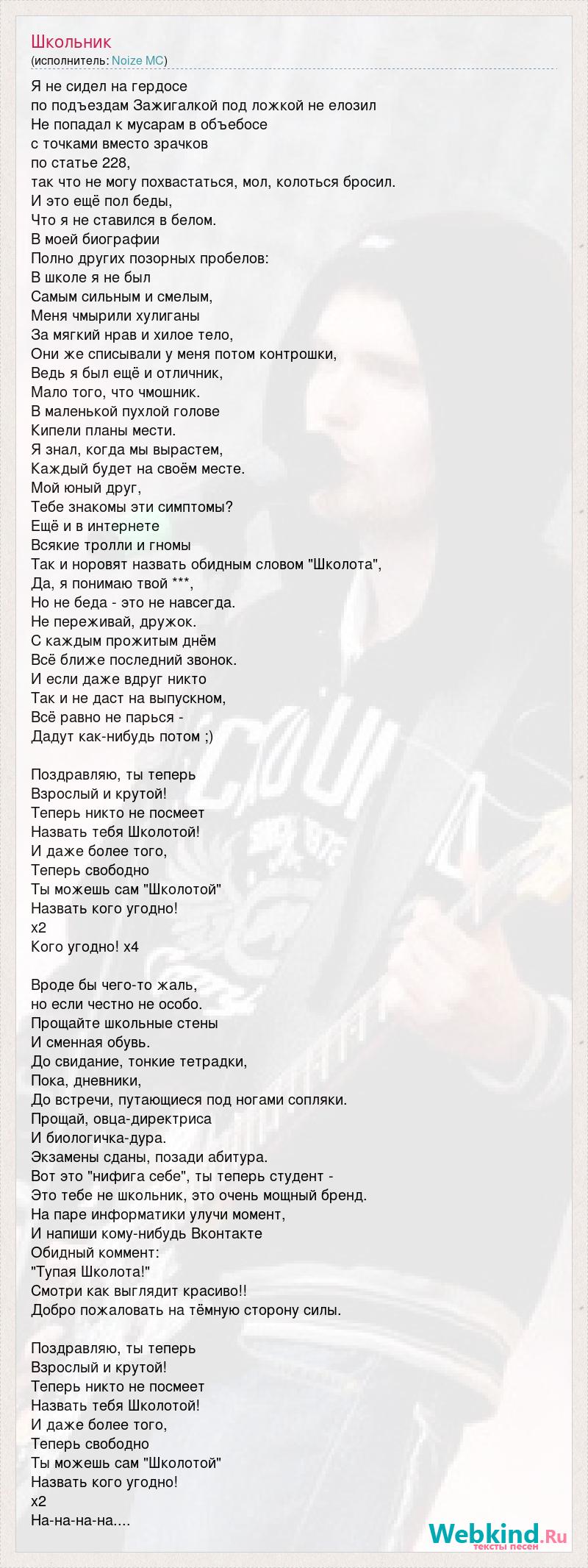 Я не сидел на гердосе по подъездам Зажигалкой под ложкой не елозил Не попадал к мусарам в объебосе с точками вместо зрачков по статье 228, так что не могу похвастаться, мол, колоться бросил. И это ещё пол беды, Что я не ставился в белом. В моей биографии Полно других позорных пробелов: В школе я не был Самым сильным и смелым, Меня чмырили хулиганы За мягкий нрав и хилое тело, Они же списывали у меня потом контрошки, Ведь я был ещё и отличник, Мало того, что чмошник. В маленькой пухлой голове Кипели планы мести. Я знал, когда мы вырастем, Каждый будет на своём месте. Мой юный друг, Тебе знакомы эти симптомы? Ещё и в интернете Всякие тролли и гномы Так и норовят назвать обидным словом "Школота", Да, я понимаю твой ***, Но не беда - это не навсегда. Не переживай, дружок. С каждым прожитым днём Всё ближе последний звонок. И если даже вдруг никто Так и не даст на выпускном, Всё равно не парься - Дадут как-нибудь потом ;) Поздравляю, ты теперь Взрослый и крутой! Теперь никто не посмеет Назвать тебя Школотой! И даже более того, Теперь свободно Ты можешь сам "Школотой" Назвать кого угодно! x2 Кого угодно! x4 Вроде бы чего-то жаль, но если честно не особо. Прощайте школьные стены И сменная обувь. До свидание, тонкие тетрадки, Пока, дневники, До встречи, путающиеся под ногами сопляки. Прощай, овца-директриса И биологичка-дура. Экзамены сданы, позади абитура. Вот это "нифига себе", ты теперь студент - Это тебе не школьник, это очень мощный бренд. На паре информатики улучи момент, И напиши кому-нибудь Вконтакте Обидный коммент: "Тупая Школота!" Смотри как выглядит красиво!! Добро пожаловать на тёмную сторону силы. Поздравляю, ты теперь Взрослый и крутой! Теперь никто не посмеет Назвать тебя Школотой! И даже более того, Теперь свободно Ты можешь сам "Школотой" Назвать кого угодно! x2 На-на-на-на....