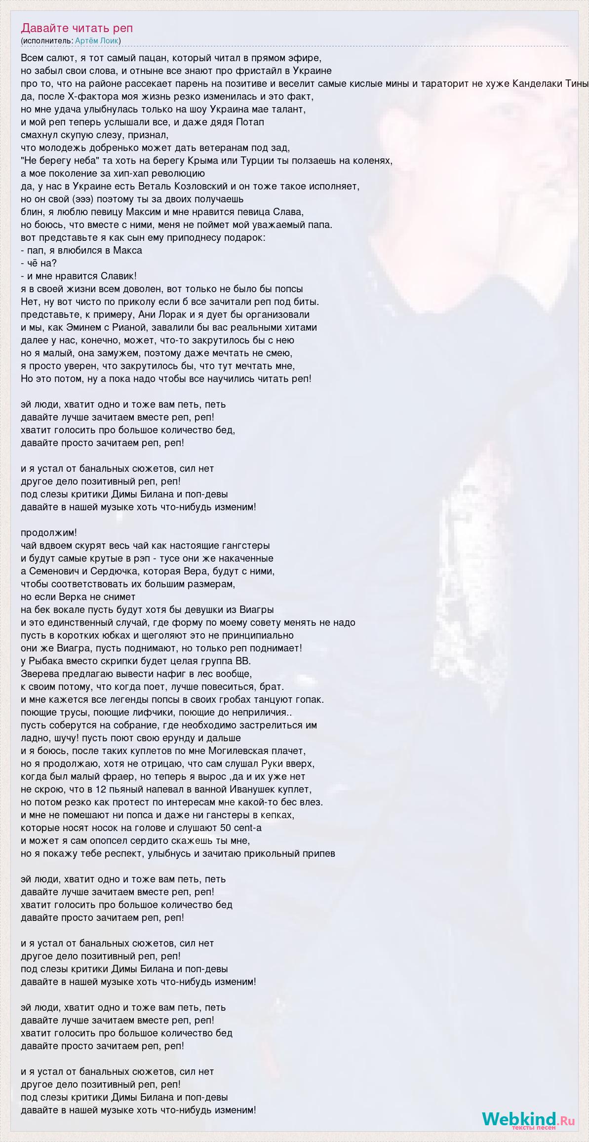 Всем салют, я тот самый пацан, который читал в прямом эфире, но забыл свои слова, и отныне все знают про фристайл в Украине про то, что на районе рассекает парень на позитиве и веселит самые кислые мины и тараторит не хуже Канделаки Тины да, после Х-фактора моя жизнь резко изменилась и это факт, но мне удача улыбнулась только на шоу Украина мае талант, и мой реп теперь услышали все, и даже дядя Потап смахнул скупую слезу, признал, что молодежь добренько может дать ветеранам под зад, "Не берегу неба" та хоть на берегу Крыма или Турции ты ползаешь на коленях, а мое поколение за хип-хап революцию да, у нас в Украине есть Веталь Козловский и он тоже такое исполняет, но он свой (эээ) поэтому ты за двоих получаешь блин, я люблю певицу Максим и мне нравится певица Слава, но боюсь, что вместе с ними, меня не поймет мой уважаемый папа. вот представьте я как сын ему приподнесу подарок: - пап, я влюбился в Макса - чё на? - и мне нравится Славик! я в своей жизни всем доволен, вот только не было бы попсы Нет, ну вот чисто по приколу если б все зачитали реп под биты. представьте, к примеру, Ани Лорак и я дует бы организовали и мы, как Эминем с Рианой, завалили бы вас реальными хитами далее у нас, конечно, может, что-то закрутилось бы с нею но я малый, она замужем, поэтому даже мечтать не смею, я просто уверен, что закрутилось бы, что тут мечтать мне, Но это потом, ну а пока надо чтобы все научились читать реп! эй люди, хватит одно и тоже вам петь, петь давайте лучше зачитаем вместе реп, реп! хватит голосить про большое количество бед, давайте просто зачитаем реп, реп! и я устал от банальных сюжетов, сил нет другое дело позитивный реп, реп! под слезы критики Димы Билана и поп-девы давайте в нашей музыке хоть что-нибудь изменим! продолжим! чай вдвоем скурят весь чай как настоящие гангстеры и будут самые крутые в рэп - тусе они же накаченные а Семенович и Сердючка, которая Вера, будут с ними, чтобы соответствовать их большим размерам, но если Верка не снимет на бек вокале пусть будут хотя бы девушки из Виагры и это единственный случай, где форму по моему совету менять не надо пусть в коротких юбках и щеголяют это не принципиально они же Виагра, пусть поднимают, но только реп поднимает! у Рыбака вместо скрипки будет целая группа ВВ. Зверева предлагаю вывести нафиг в лес вообще, к своим потому, что когда поет, лучше повеситься, брат. и мне кажется все легенды попсы в своих гробах танцуют гопак. поющие трусы, поющие лифчики, поющие до неприличия.. пусть соберутся на собрание, где необходимо застрелиться им ладно, шучу! пусть поют свою ерунду и дальше и я боюсь, после таких куплетов по мне Могилевская плачет, но я продолжаю, хотя не отрицаю, что сам слушал Руки вверх, когда был малый фраер, но теперь я вырос ,да и их уже нет не скрою, что в 12 пьяный напевал в ванной Иванушек куплет, но потом резко как протест по интересам мне какой-то бес влез. и мне не помешают ни попса и даже ни ганстеры в кепках, которые носят носок на голове и слушают 50 cent-а и может я сам опопсел сердито скажешь ты мне, но я покажу тебе респект, улыбнусь и зачитаю прикольный припев эй люди, хватит одно и тоже вам петь, петь давайте лучше зачитаем вместе реп, реп! хватит голосить про большое количество бед давайте просто зачитаем реп, реп! и я устал от банальных сюжетов, сил нет другое дело позитивный реп, реп! под слезы критики Димы Билана 