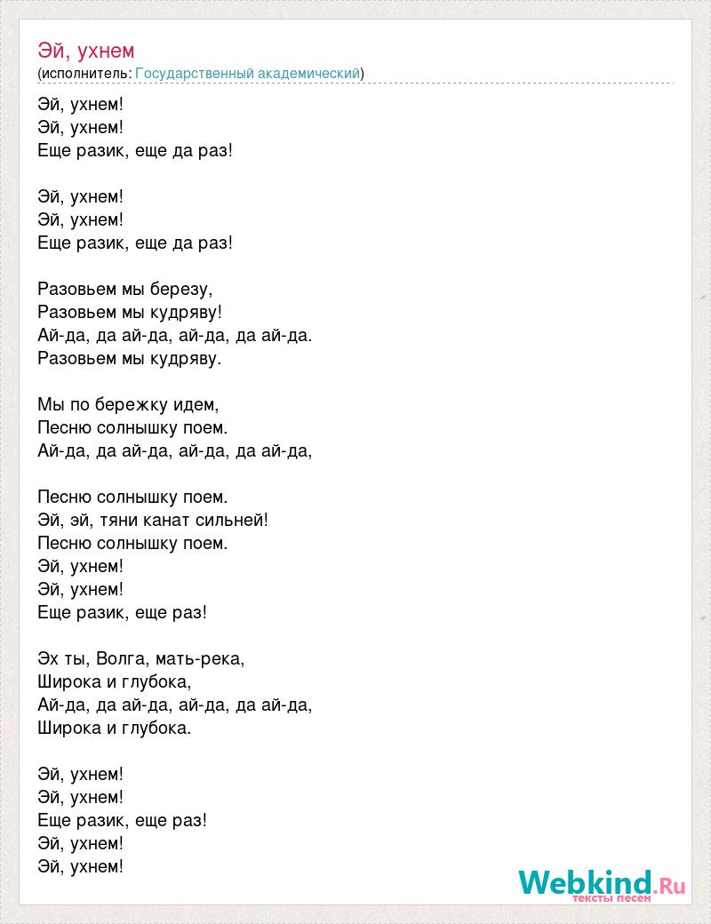 Эй, ухнем! Эй, ухнем! Еще разик, еще да раз! Эй, ухнем! Эй, ухнем! Еще разик, еще да раз! Разовьем мы березу, Разовьем мы кудряву! Ай-да, да ай-да, ай-да, да ай-да. Разовьем мы кудряву. Мы по бережку идем, Песню солнышку поем. Ай-да, да ай-да, ай-да, да ай-да, Песню солнышку поем. Эй, эй, тяни канат сильней! Песню солнышку поем. Эй, ухнем! Эй, ухнем! Еще разик, еще раз! Эх ты, Волга, мать-река, Широка и глубока, Ай-да, да ай-да, ай-да, да ай-да, Широка и глубока. Эй, ухнем! Эй, ухнем! Еще разик, еще раз! Эй, ухнем! Эй, ухнем!