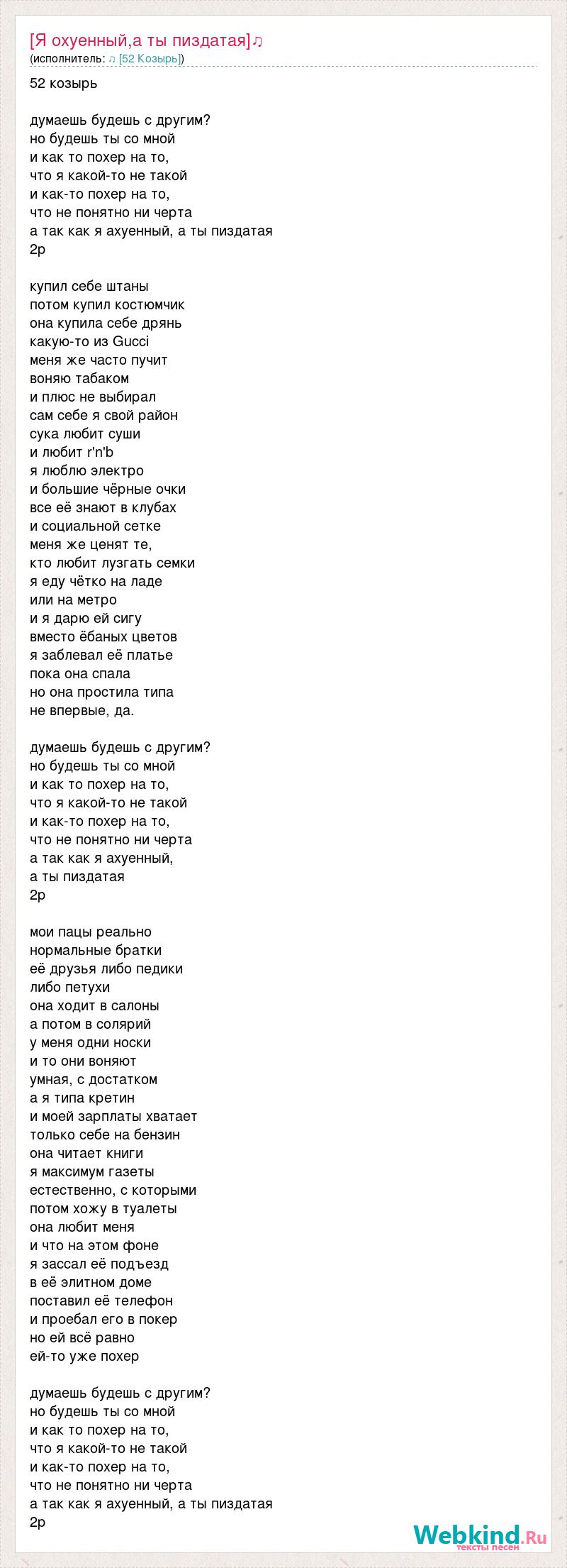 52 козырь думаешь будешь с другим? но будешь ты со мной и как то похер на то, что я какой-то не такой и как-то похер на то, что не понятно ни черта а так как я ахуенный, а ты пиздатая 2р купил себе штаны потом купил костюмчик она купила себе дрянь какую-то из Gucci меня же часто пучит воняю табаком и плюс не выбирал сам себе я свой район сука любит суши и любит r'n'b я люблю электро и большие чёрные очки все её знают в клубах и социальной сетке меня же ценят те, кто любит лузгать семки я еду чётко на ладе или на метро и я дарю ей сигу вместо ёбаных цветов я заблевал её платье пока она спала но она простила типа не впервые, да. думаешь будешь с другим? но будешь ты со мной и как то похер на то, что я какой-то не такой и как-то похер на то, что не понятно ни черта а так как я ахуенный, а ты пиздатая 2р мои пацы реально нормальные братки её друзья либо педики либо петухи она ходит в салоны а потом в солярий у меня одни носки и то они воняют умная, с достатком а я типа кретин и моей зарплаты хватает только себе на бензин она читает книги я максимум газеты естественно, с которыми потом хожу в туалеты она любит меня и что на этом фоне я зассал её подъезд в её элитном доме поставил её телефон и проебал его в покер но ей всё равно ей-то уже похер думаешь будешь с другим? но будешь ты со мной и как то похер на то, что я какой-то не такой и как-то похер на то, что не понятно ни черта а так как я ахуенный, а ты пиздатая 2р