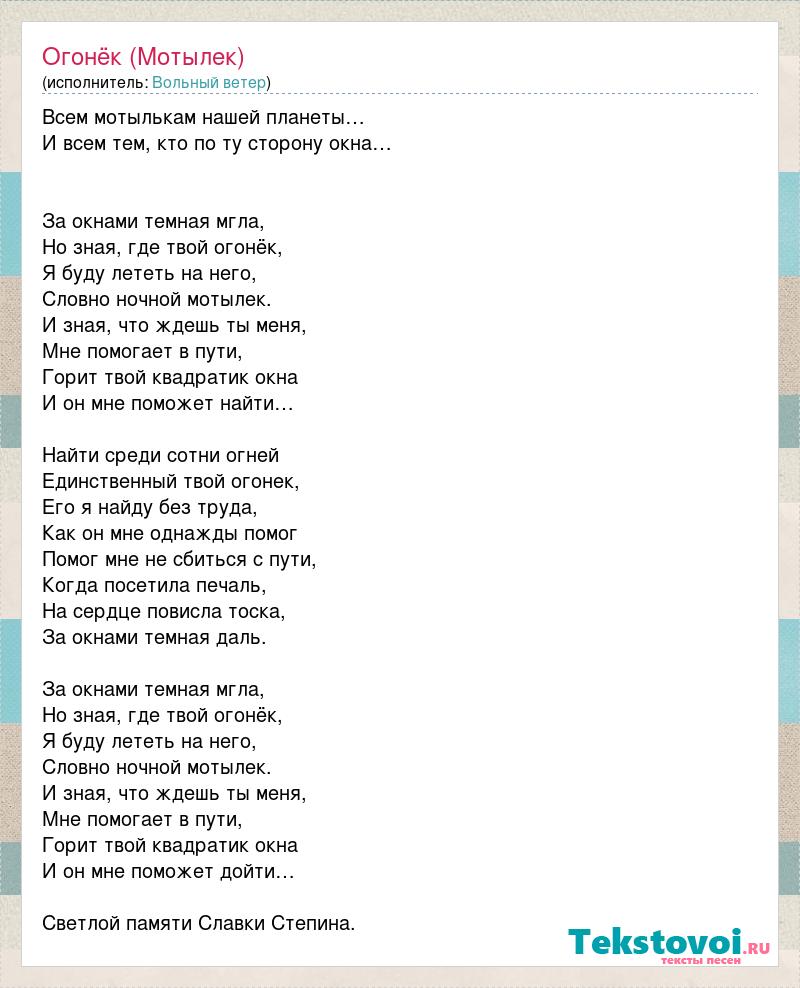 Всем мотылькам нашей планеты… И всем тем, кто по ту сторону окна… За окнами темная мгла, Но зная, где твой огонёк, Я буду лететь на него, Словно ночной мотылек. И зная, что ждешь ты меня, Мне помогает в пути, Горит твой квадратик окна И он мне поможет найти… Найти среди сотни огней Единственный твой огонек, Его я найду без труда, Как он мне однажды помог Помог мне не сбиться с пути, Когда посетила печаль, На сердце повисла тоска, За окнами темная даль. За окнами темная мгла, Но зная, где твой огонёк, Я буду лететь на него, Словно ночной мотылек. И зная, что ждешь ты меня, Мне помогает в пути, Горит твой квадратик окна И он мне поможет дойти… Светлой памяти Славки Степина.