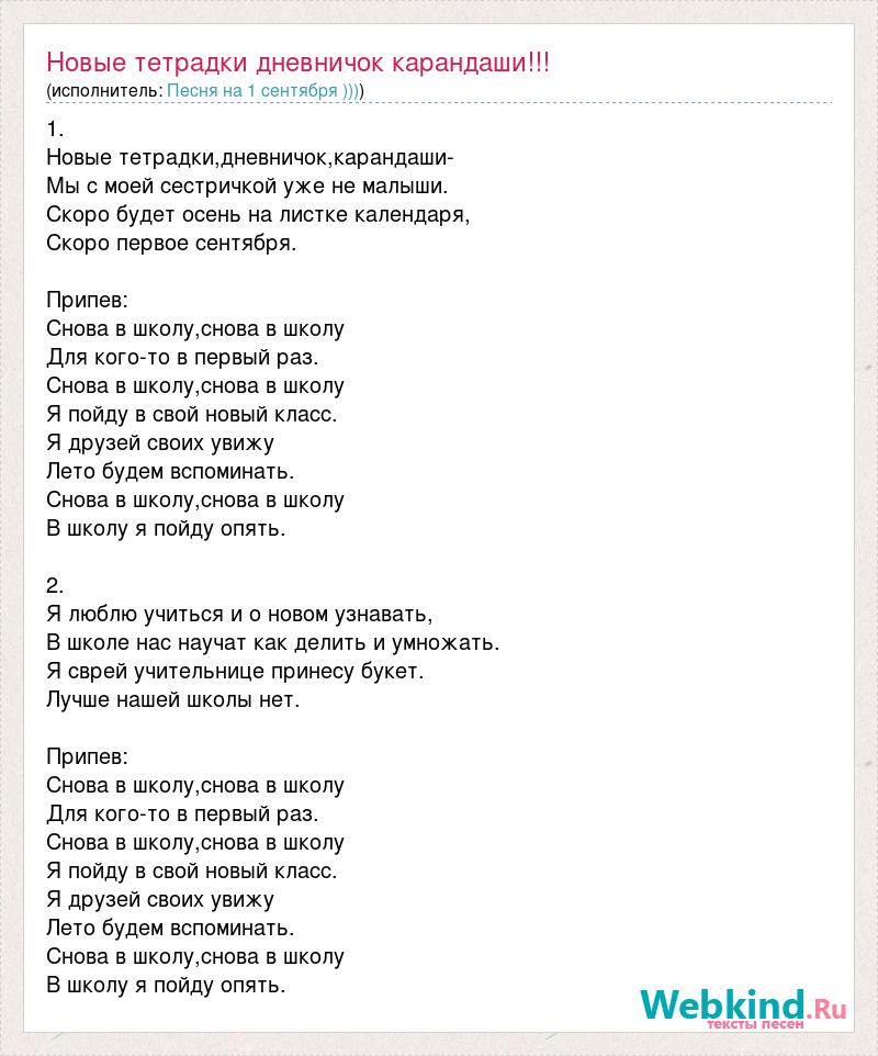 1. Новые тетрадки,дневничок,карандаши- Мы с моей сестричкой уже не малыши. Скоро будет осень на листке календаря, Скоро первое сентября. Припев: Снова в школу,снова в школу Для кого-то в первый раз. Снова в школу,снова в школу Я пойду в свой новый класс. Я друзей своих увижу Лето будем вспоминать. Снова в школу,снова в школу В школу я пойду опять. 2. Я люблю учиться и о новом узнавать, В школе нас научат как делить и умножать. Я сврей учительнице принесу букет. Лучше нашей школы нет. Припев: Снова в школу,снова в школу Для кого-то в первый раз. Снова в школу,снова в школу Я пойду в свой новый класс. Я друзей своих увижу Лето будем вспоминать. Снова в школу,снова в школу В школу я пойду опять.