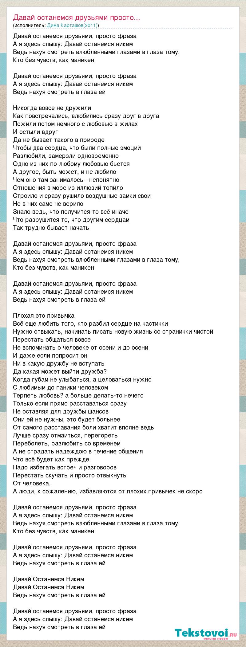 Давай останемся друзьями, просто фраза А я здесь слышу: Давай останемся никем Ведь нахуя смотреть влюбленными глазами в глаза тому, Кто без чувств, как маникен Давай останемся друзьями, просто фраза А я здесь слышу: Давай останемся никем Ведь нахуя смотреть в глаза ей Никогда вовсе не дружили Как повстречались, влюбились сразу друг в друга Пожили потом немного с любовью в жилах И остыли вдруг Да не бывает такого в природе Чтобы два сердца, что были полные эмоций Разлюбили, замерзли одновременно Одно из них по-любому любовью бьется А другое, быть может, и не любило Чем оно там занималось - непонятно Отношения в море из иллюзий топило Строило и сразу рушило воздушные замки свои Но в них само не верило Знало ведь, что получится-то всё иначе Что разрушится то, что другим сердцам Так трудно бывает начать Давай останемся друзьями, просто фраза А я здесь слышу: Давай останемся никем Ведь нахуя смотреть влюбленными глазами в глаза тому, Кто без чувств, как маникен Давай останемся друзьями, просто фраза А я здесь слышу: Давай останемся никем Ведь нахуя смотреть в глаза ей Плохая это привычка Всё еще любить того, кто разбил сердце на частички Нужно отвыкать, начинать писать новую жизнь со странички чистой Перестать общаться вовсе Не вспоминать о человеке от осени и до осени И даже если попросит он Ни в какую дружбу не вступать Да какая может выйти дружба? Когда губам не улыбаться, а целоваться нужно С любимым до паники человеком Терпеть любовь? а больше делать-то нечего Только если прямо расставаться сразу Не оставляя для дружбы шансов Они ей не нужны, это будет больнее От самого расставания боли хватит вполне ведь Лучше сразу отмаиться, перегореть Переболеть, разлюбить со временем А не страдать надеждою в течение общения Что всё будет как прежде Надо избегать встреч и разговоров Перестать скучать и просто отвыкнуть От человека, А люди, к сожалению, избавляются от плохих привычек не скоро Давай останемся друзьями, просто фраза А я здесь слышу: Давай останемся никем Ведь нахуя смотреть влюбленными глазами в глаза тому, Кто без чувств, как маникен Давай останемся друзьями, просто фраза А я здесь слышу: Давай останемся никем Ведь нахуя смотреть в глаза ей Давай Останемся Никем Давай Останемся Никем Ведь нахуя смотреть в глаза ей Давай останемся друзьями, просто фраза А я здесь слышу: Давай останемся никем Ведь нахуя смотреть в глаза ей