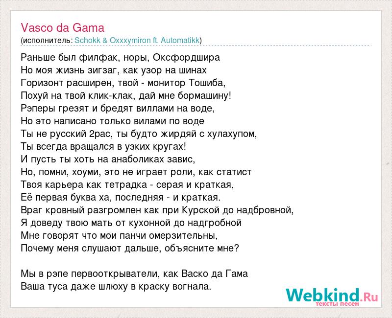 Раньше был филфак, норы, Оксфордшира Но моя жизнь зигзаг, как узор на шинах Горизонт расширен, твой - монитор Тошиба, Похуй на твой клик-клак, дай мне бормашину! Рэперы грезят и бредят виллами на воде, Но это написано только вилами по воде Ты не русский 2pac, ты будто жирдяй с хулахупом, Ты всегда вращался в узких кругах! И пусть ты хоть на анаболиках завис, Но, помни, хоуми, это не играет роли, как статист Твоя карьера как тетрадка - серая и краткая, Её первая буква ха, последняя - и краткая. Враг кровный разгромлен как при Курской до надбровной, Я доведу твою мать от кухонной до надгробной Мне говорят что мои панчи омерзительны, Почему меня слушают дальше, объясните мне? Мы в рэпе первооткрыватели, как Васко да Гама Ваша туса даже шлюху в краску вогнала.