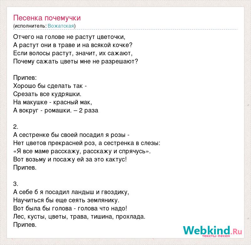 Отчего на голове не растут цветочки, А растут они в траве и на всякой кочке? Если волосы растут, значит, их сажают, Почему сажать цветы мне не разрешают? Припев: Хорошо бы сделать так - Срезать все кудряшки. На макушке - красный мак, А вокруг - ромашки. – 2 раза 2. А сестренке бы своей посадил я розы - Нет цветов прекрасней роз, а сестренка в слезы: «Я все маме расскажу, расскажу и спрячусь». Вот возьму и посажу ей за это кактус! Припев. 3. А себе б я посадил ландыш и гвоздику, Научиться бы еще сеять землянику. Вот была бы голова - голова что надо! Лес, кусты, цветы, трава, тишина, прохлада. Припев.