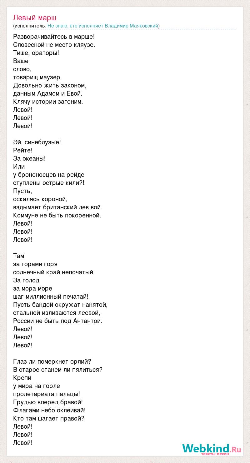 Разворачивайтесь в марше! Словесной не место кляузе. Тише, ораторы! Ваше слово, товарищ маузер. Довольно жить законом, данным Адамом и Евой. Клячу истории загоним. Левой! Левой! Левой! Эй, синеблузые! Рейте! За океаны! Или у броненосцев на рейде ступлены острые кили?! Пусть, оскалясь короной, вздымает британский лев вой. Коммуне не быть покоренной. Левой! Левой! Левой! Там за горами горя солнечный край непочатый. За голод за мора море шаг миллионный печатай! Пусть бандой окружат нанятой, стальной изливаются леевой,- России не быть под Антантой. Левой! Левой! Левой! Глаз ли померкнет орлий? В старое станем ли пялиться? Крепи у мира на горле пролетариата пальцы! Грудью вперед бравой! Флагами небо оклеивай! Кто там шагает правой? Левой! Левой! Левой!