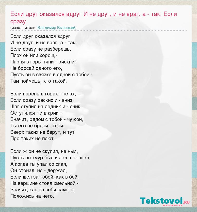 Если друг оказался вдруг И не друг, и не враг, а - так, Если сразу не разберешь, Плох он или хорош,- Парня в горы тяни - рискни! Не бросай одного его, Пусть он в связке в одной с тобой - Там поймешь, кто такой. Если парень в горах - не ах, Если сразу раскис и - вниз, Шаг ступил на ледник и - сник, Оступился - и в крик,- Значит, рядом с тобой - чужой, Ты его не брани - гони: Вверх таких не берут, и тут Про таких не поют. Если ж он не скулил, не ныл, Пусть он хмур был и зол, но - шел, А когда ты упал со скал, Он стонал, но - держал, Если шел за тобой, как в бой, На вершине стоял хмельной,- Значит, как на себя самого, Положись на него.