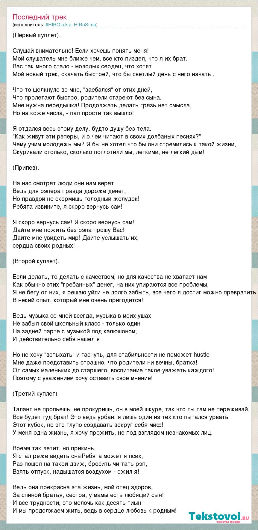 (Первый куплет). Слушай внимательно! Если хочешь понять меня! Мой слушатель мне ближе чем, все кто пиздел, что я их брат. Вас так много стало - молодых сердец, что хотят Мой новый трек, скачать быстрей, что бы светлый день с него начать . Что-то щелкнуло во мне, "заебался" от этих дней, Что пролетают быстро, родители стареют без сына. Мне нужна передышка! Продолжать делать грязь нет смысла, Но на коже числа, - пап прости так вышло! Я отдался весь этому делу, будто душу без тела. "Как живут эти рэперы, и о чем читают в своих долбаных песнях?" Чему учим молодежь мы? Я бы не хотел что бы они стремились к такой жизни, Скуривали столько, сколько поглотили мы, легкими, не легкий дым! (Припев). На нас смотрят люди они нам верят, Ведь для рэпера правда дороже денег, Но правдой не скормишь голодный желудок! Ребята извините, я скоро вернусь сам! Я скоро вернусь сам! Я скоро вернусь сам! Дайте мне пожить без рэпа прошу Вас! Дайте мне увидеть мир! Дайте услышать их, сердца своих родных! (Второй куплет). Если делать, то делать с качеством, но для качества не хватает нам Как обычно этих "гребанных" денег, на них упираются все проблемы, Я не бегу от них, я решаю уйти не долго забыть, все чего я достиг можно превратить В некий опыт, который мне очень пригодится! Ведь музыка со мной всегда, музыка в моих ушах Не забыл свой школьный класс - только один На задней парте с музыкой под капюшоном, И действительно себя нашел я Но не хочу "вспыхать" и гаснуть, для стабильности не поможет hustle Мне даже представить страшно, что родители ни вечны, братка! От самых маленьких до старшего, воспитание такое уважать каждого! Поэтому с уважением хочу оставить свое мнение! (Третий куплет) Талант не пропьешь, не прокуришь, он в моей шкуре, так что ты там не переживай, Все будет гуд брат! Это ведь урбан, я лишь один из тех кто пытался урвать Этот кубок, но это глупо создавать вокруг себя миф! У меня одна жизнь, я хочу прожить, не под взглядом незнакомых лиц. Время так летит, но прикинь, Я стал реже видеть сныРебята может я псих, Раз пошел на такой движ, бросить чи-тать рэп, Взять отпуск, надышатся воздухом - ожил я! Ведь она прекрасна эта жизнь, мой отец здоров, За спиной братья, сестра, у мамы есть любящий сын! И все трудности, это мелочь как десять тиын И мы продолжаем жить, ведь в сердце любовь к родным!