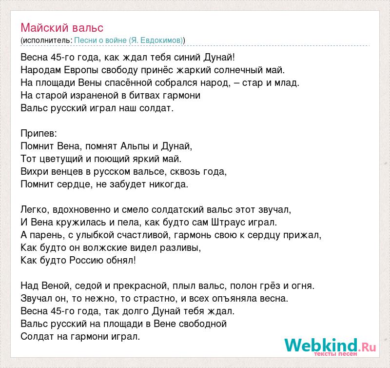 Весна 45-го года, как ждал тебя синий Дунай! Народам Европы свободу принёс жаркий солнечный май. На площади Вены спасённой собрался народ, – стар и млад. На старой израненой в битвах гармони Вальс русский играл наш солдат. Припев: Помнит Вена, помнят Альпы и Дунай, Тот цветущий и поющий яркий май. Вихри венцев в русском вальсе, сквозь года, Помнит сердце, не забудет никогда. Легко, вдохновенно и смело солдатский вальс этот звучал, И Вена кружилась и пела, как будто сам Штраус играл. А парень, с улыбкой счастливой, гармонь свою к сердцу прижал, Как будто он волжские видел разливы, Как будто Россию обнял! Над Веной, седой и прекрасной, плыл вальс, полон грёз и огня. Звучал он, то нежно, то страстно, и всех опъяняла весна. Весна 45-го года, так долго Дунай тебя ждал. Вальс русский на площади в Вене свободной Солдат на гармони играл.