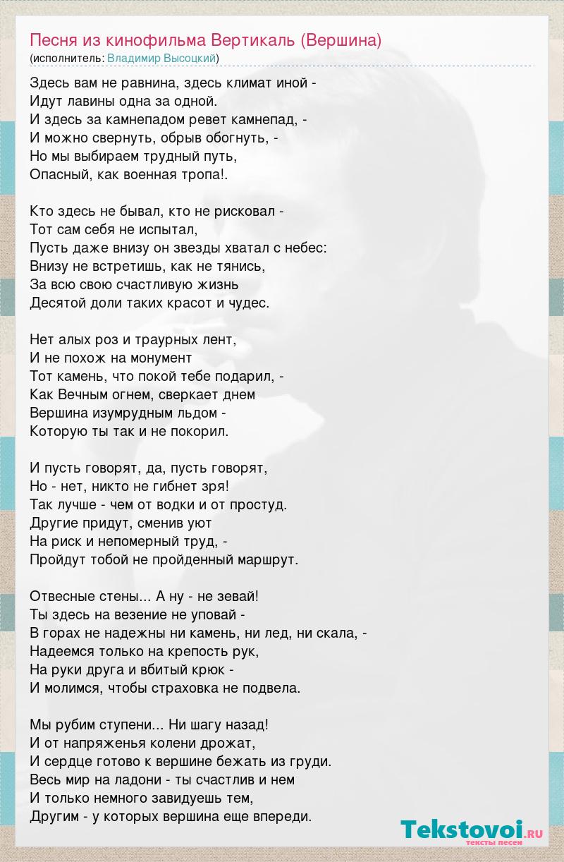 Здесь вам не равнина, здесь климат иной - Идут лавины одна за одной. И здесь за камнепадом ревет камнепад, - И можно свернуть, обрыв обогнуть, - Но мы выбираем трудный путь, Опасный, как военная тропа!. Кто здесь не бывал, кто не рисковал - Тот сам себя не испытал, Пусть даже внизу он звезды хватал с небес: Внизу не встретишь, как не тянись, За всю свою счастливую жизнь Десятой доли таких красот и чудес. Нет алых роз и траурных лент, И не похож на монумент Тот камень, что покой тебе подарил, - Как Вечным огнем, сверкает днем Вершина изумрудным льдом - Которую ты так и не покорил. И пусть говорят, да, пусть говорят, Но - нет, никто не гибнет зря! Так лучше - чем от водки и от простуд. Другие придут, сменив уют На риск и непомерный труд, - Пройдут тобой не пройденный маршрут. Отвесные стены... А ну - не зевай! Ты здесь на везение не уповай - В горах не надежны ни камень, ни лед, ни скала, - Надеемся только на крепость рук, На руки друга и вбитый крюк - И молимся, чтобы страховка не подвела. Мы рубим ступени... Ни шагу назад! И от напряженья колени дрожат, И сердце готово к вершине бежать из груди. Весь мир на ладони - ты счастлив и нем И только немного завидуешь тем, Другим - у которых вершина еще впереди.