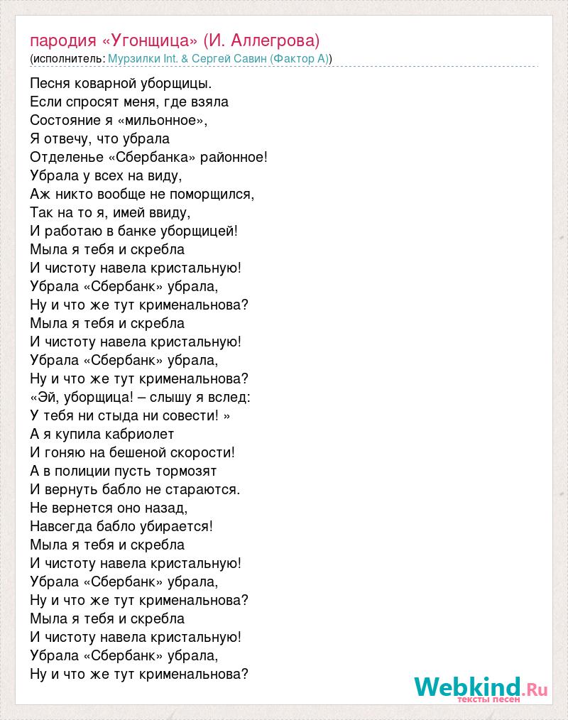 Песня коварной уборщицы. Если спросят меня, где взяла Состояние я «мильонное», Я отвечу, что убрала Отделенье «Сбербанка» районное! Убрала у всех на виду, Аж никто вообще не поморщился, Так на то я, имей ввиду, И работаю в банке уборщицей! Мыла я тебя и скребла И чистоту навела кристальную! Убрала «Сбербанк» убрала, Ну и что же тут крименальнова? Мыла я тебя и скребла И чистоту навела кристальную! Убрала «Сбербанк» убрала, Ну и что же тут крименальнова? «Эй, уборщица! – слышу я вслед: У тебя ни стыда ни совести! » А я купила кабриолет И гоняю на бешеной скорости! А в полиции пусть тормозят И вернуть бабло не стараются. Не вернется оно назад, Навсегда бабло убирается! Мыла я тебя и скребла И чистоту навела кристальную! Убрала «Сбербанк» убрала, Ну и что же тут крименальнова? Мыла я тебя и скребла И чистоту навела кристальную! Убрала «Сбербанк» убрала, Ну и что же тут крименальнова?