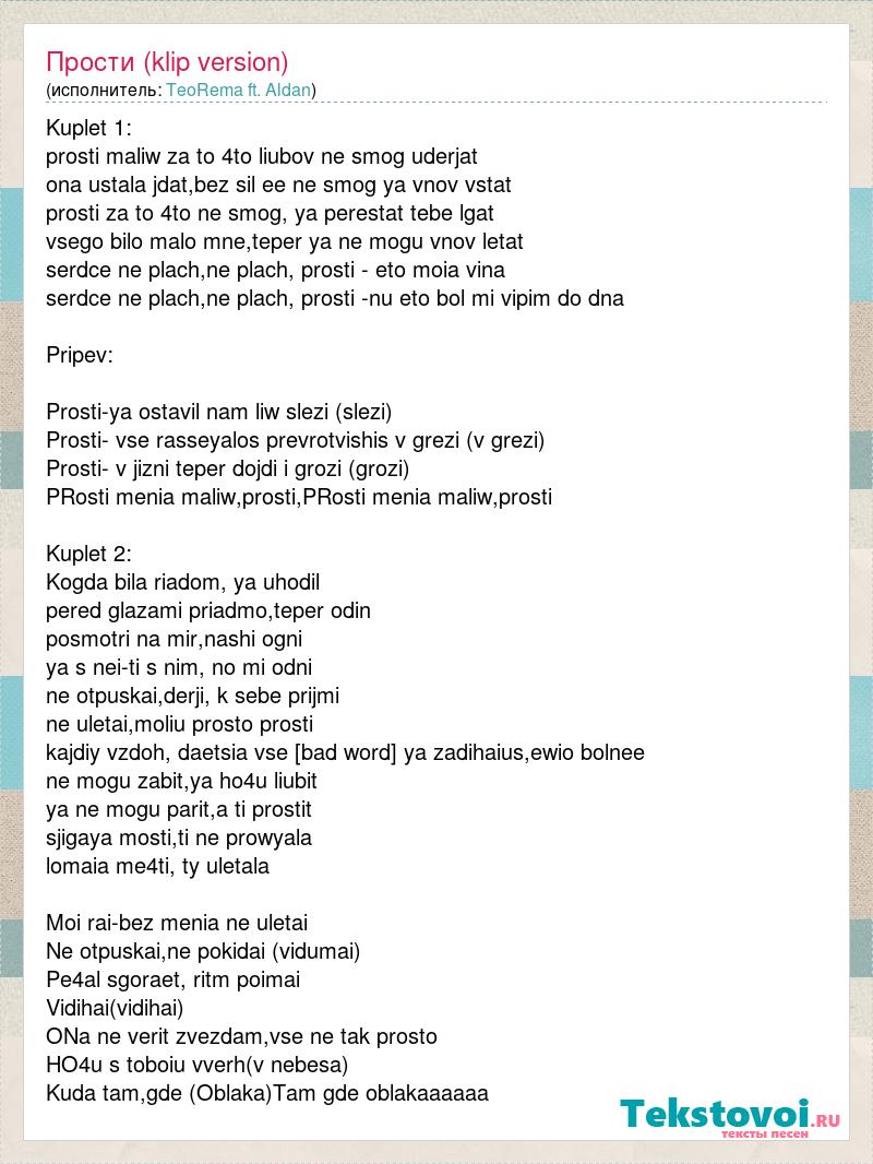 Kuplet 1: prosti maliw za to 4to liubov ne smog uderjat ona ustala jdat,bez sil ee ne smog ya vnov vstat prosti za to 4to ne smog, ya perestat tebe lgat vsego bilo malo mne,teper ya ne mogu vnov letat serdce ne plach,ne plach, prosti - eto moia vina serdce ne plach,ne plach, prosti -nu eto bol mi vipim do dna Pripev: Prosti-ya ostavil nam liw slezi (slezi) Prosti- vse rasseyalos prevrotvishis v grezi (v grezi) Prosti- v jizni teper dojdi i grozi (grozi) PRosti menia maliw,prosti,PRosti menia maliw,prosti Kuplet 2: Kogda bila riadom, ya uhodil pered glazami priadmo,teper odin posmotri na mir,nashi ogni ya s nei-ti s nim, no mi odni ne otpuskai,derji, k sebe prijmi ne uletai,moliu prosto prosti kajdiy vzdoh, daetsia vse trudnee ya zadihaius,ewio bolnee ne mogu zabit,ya ho4u liubit ya ne mogu parit,a ti prostit sjigaya mosti,ti ne prowyala lomaia me4ti, ty uletala Moi rai-bez menia ne uletai Ne otpuskai,ne pokidai (vidumai) Pe4al sgoraet, ritm poimai Vidihai(vidihai) ONa ne verit zvezdam,vse ne tak prosto HO4u s toboiu vverh(v nebesa) Kuda tam,gde (Oblaka)Tam gde oblakaaaaaa