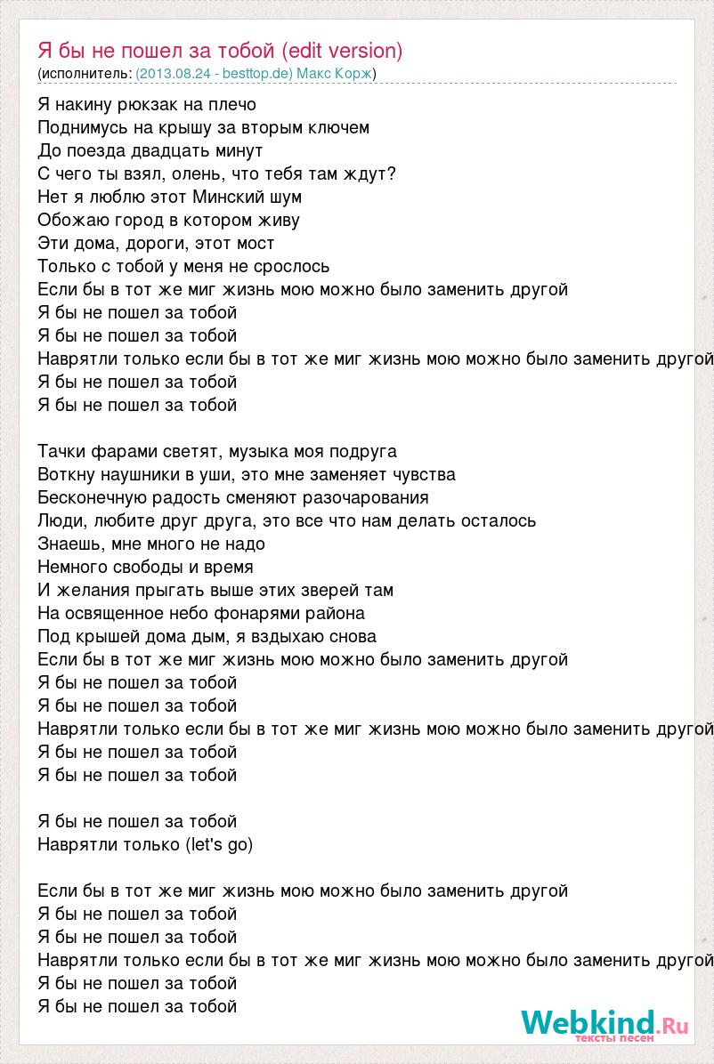 Я накину рюкзак на плечо Поднимусь на крышу за вторым ключем До поезда двадцать минут С чего ты взял, олень, что тебя там ждут? Нет я люблю этот Минский шум Обожаю город в котором живу Эти дома, дороги, этот мост Только с тобой у меня не срослось Если бы в тот же миг жизнь мою можно было заменить другой Я бы не пошел за тобой Я бы не пошел за тобой Наврятли только если бы в тот же миг жизнь мою можно было заменить другой Я бы не пошел за тобой Я бы не пошел за тобой Тачки фарами светят, музыка моя подруга Воткну наушники в уши, это мне заменяет чувства Бесконечную радость сменяют разочарования Люди, любите друг друга, это все что нам делать осталось Знаешь, мне много не надо Немного свободы и время И желания прыгать выше этих зверей там На освященное небо фонарями района Под крышей дома дым, я вздыхаю снова Если бы в тот же миг жизнь мою можно было заменить другой Я бы не пошел за тобой Я бы не пошел за тобой Наврятли только если бы в тот же миг жизнь мою можно было заменить другой Я бы не пошел за тобой Я бы не пошел за тобой Я бы не пошел за тобой Наврятли только (let's go) Если бы в тот же миг жизнь мою можно было заменить другой Я бы не пошел за тобой Я бы не пошел за тобой Наврятли только если бы в тот же миг жизнь мою можно было заменить другой Я бы не пошел за тобой Я бы не пошел за тобой