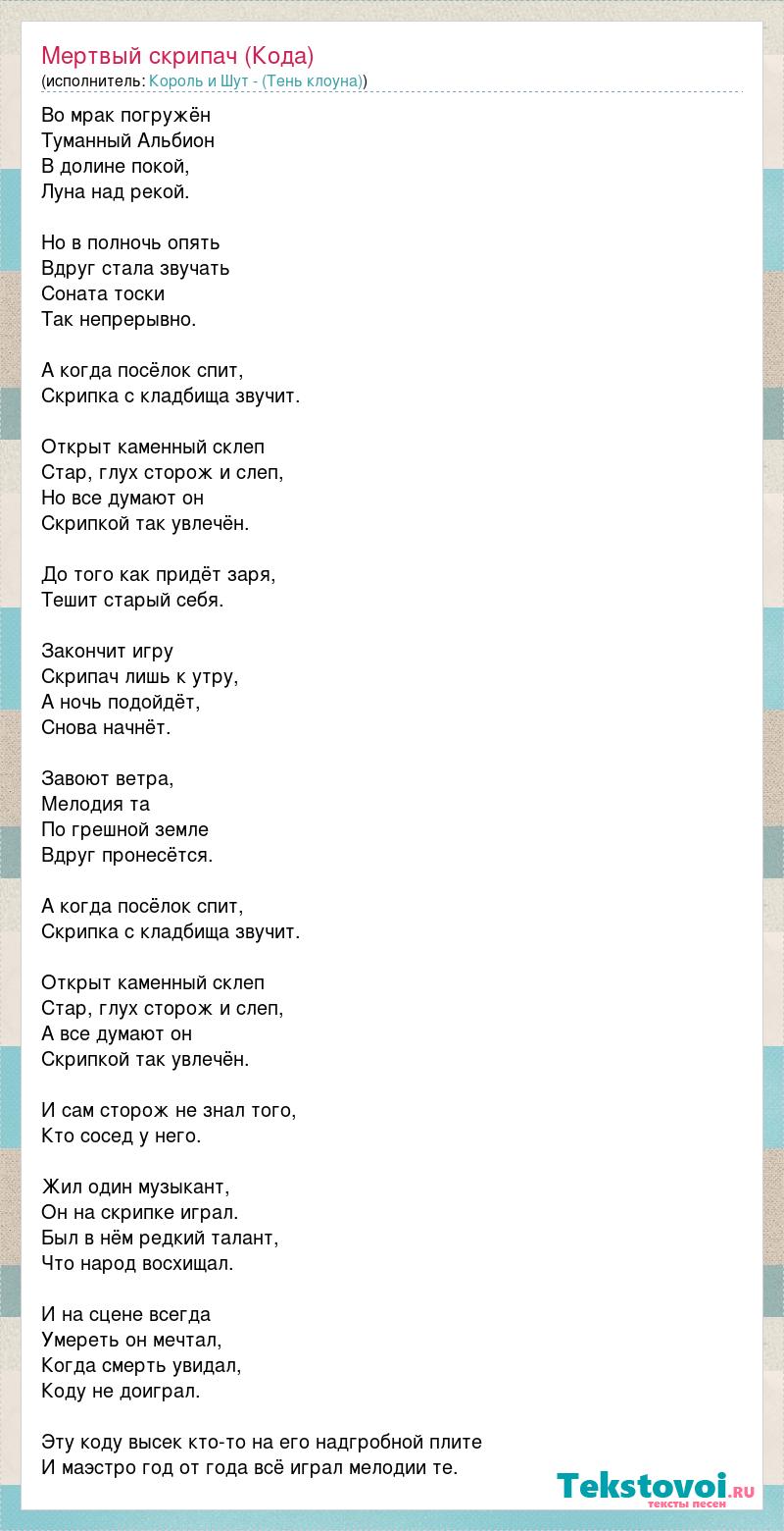 Во мрак погружён Туманный Альбион В долине покой, Луна над рекой. Но в полночь опять Вдруг стала звучать Соната тоски Так непрерывно. А когда посёлок спит, Скрипка с кладбища звучит. Открыт каменный склеп Стар, глух сторож и слеп, Но все думают он Скрипкой так увлечён. До того как придёт заря, Тешит старый себя. Закончит игру Скрипач лишь к утру, А ночь подойдёт, Снова начнёт. Завоют ветра, Мелодия та По грешной земле Вдруг пронесётся. А когда посёлок спит, Скрипка с кладбища звучит. Открыт каменный склеп Стар, глух сторож и слеп, А все думают он Скрипкой так увлечён. И сам сторож не знал того, Кто сосед у него. Жил один музыкант, Он на скрипке играл. Был в нём редкий талант, Что народ восхищал. И на сцене всегда Умереть он мечтал, Когда смерть увидал, Коду не доиграл. Эту коду высек кто-то на его надгробной плите И маэстро год от года всё играл мелодии те.
