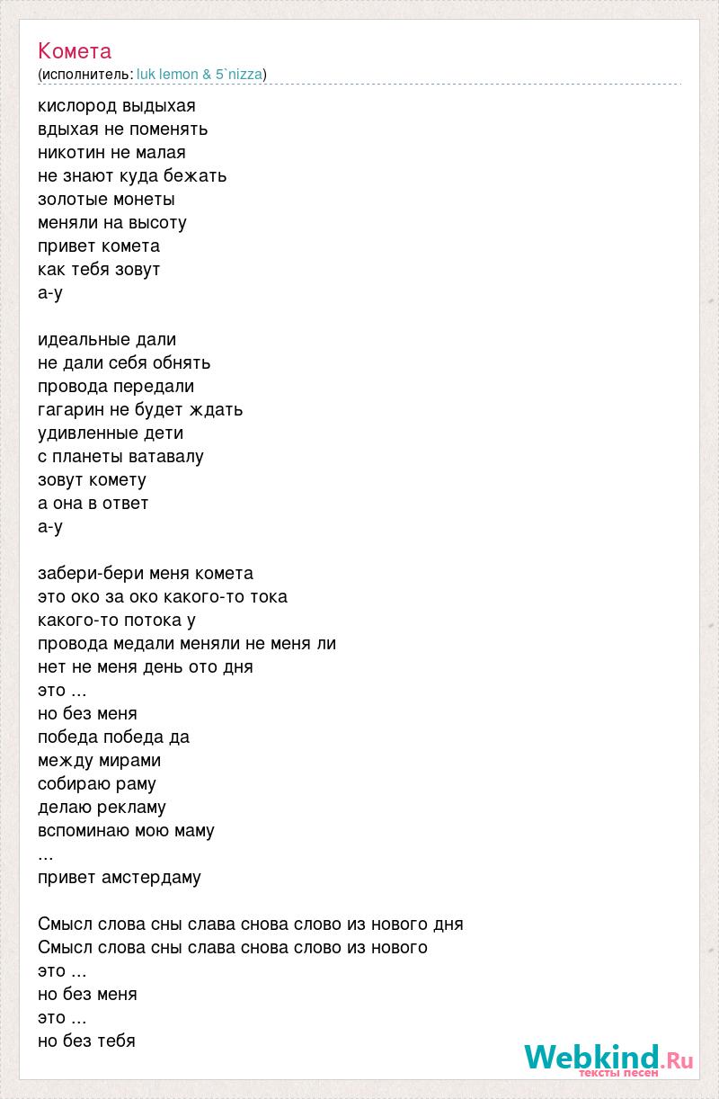 кислород выдыхая вдыхая не поменять никотин не малая не знают куда бежать золотые монеты меняли на высоту привет комета как тебя зовут а-у идеальные дали не дали себя обнять провода передали гагарин не будет ждать удивленные дети с планеты ватавалу зовут комету а она в ответ а-у забери-бери меня комета это око за око какого-то тока какого-то потока у провода медали меняли не меня ли нет не меня день ото дня это ... но без меня победа победа да между мирами собираю раму делаю рекламу вспоминаю мою маму ... привет амстердаму Смысл слова сны слава снова слово из нового дня Смысл слова сны слава снова слово из нового это ... но без меня это ... но без тебя