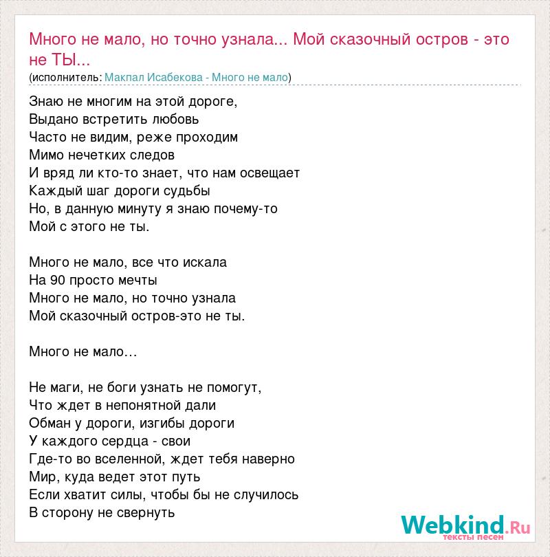 Знаю не многим на этой дороге, Выдано встретить любовь Часто не видим, реже проходим Мимо нечетких следов И вряд ли кто-то знает, что нам освещает Каждый шаг дороги судьбы Но, в данную минуту я знаю почему-то Мой с этого не ты. Много не мало, все что искала На 90 просто мечты Много не мало, но точно узнала Мой сказочный остров-это не ты. Много не мало… Не маги, не боги узнать не помогут, Что ждет в непонятной дали Обман у дороги, изгибы дороги У каждого сердца - свои Где-то во вселенной, ждет тебя наверно Мир, куда ведет этот путь Если хватит силы, чтобы бы не случилось В сторону не свернуть