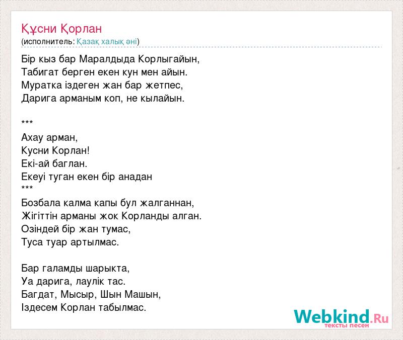 Бiр кыз бар Маралдыда Корлыгайын, Табигат берген екен кун мен айын. Муратка iздеген жан бар жетпес, Дарига арманым коп, не кылайын. *** Ахау арман, Кусни Корлан! Екi-ай баглан. Екеуi туган екен бiр анадан *** Бозбала калма капы бул жалганнан, Жiгiттiн арманы жок Корланды алган. Озiндей бiр жан тумас, Туса туар артылмас. Бар галамды шарыкта, Уа дарига, лаулiк тас. Багдат, Мысыр, Шын Машын, Iздесем Корлан табылмас.