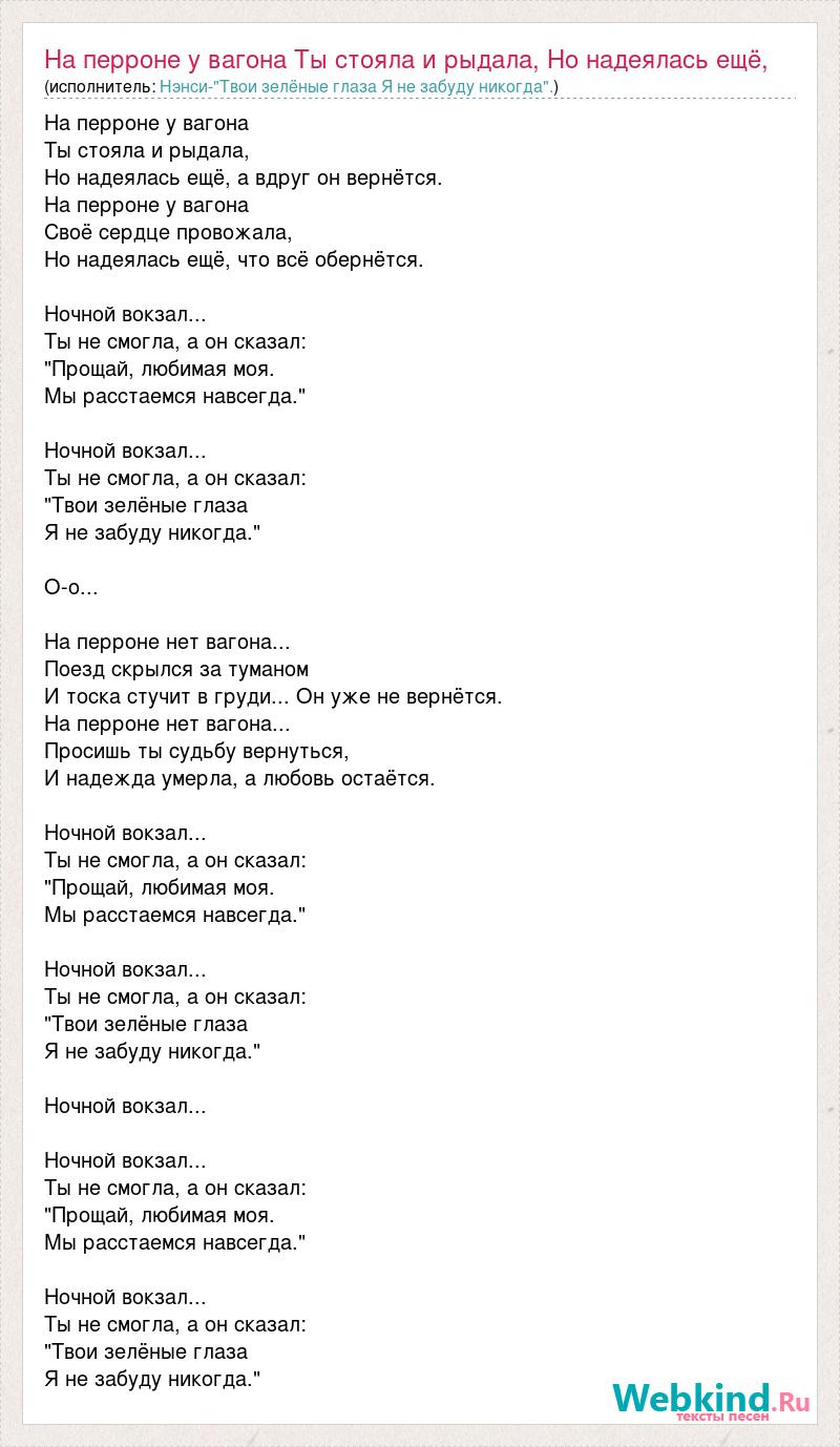 На перроне у вагона Ты стояла и рыдала, Но надеялась ещё, а вдруг он вернётся. На перроне у вагона Своё сердце провожала, Но надеялась ещё, что всё обернётся. Ночной вокзал... Ты не смогла, а он сказал: "Прощай, любимая моя. Мы расстаемся навсегда." Ночной вокзал... Ты не смогла, а он сказал: "Твои зелёные глаза Я не забуду никогда." О-о... На перроне нет вагона... Поезд скрылся за туманом И тоска стучит в груди... Он уже не вернётся. На перроне нет вагона... Просишь ты судьбу вернуться, И надежда умерла, а любовь остаётся. Ночной вокзал... Ты не смогла, а он сказал: "Прощай, любимая моя. Мы расстаемся навсегда." Ночной вокзал... Ты не смогла, а он сказал: "Твои зелёные глаза Я не забуду никогда." Ночной вокзал... Ночной вокзал... Ты не смогла, а он сказал: "Прощай, любимая моя. Мы расстаемся навсегда." Ночной вокзал... Ты не смогла, а он сказал: "Твои зелёные глаза Я не забуду никогда."