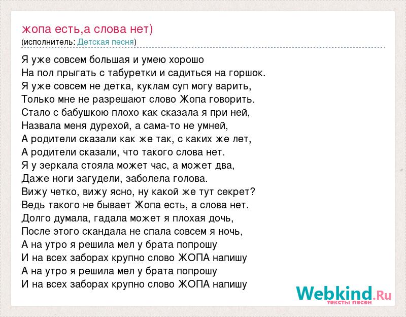 Я уже совсем большая и умею хорошо На пол прыгать с табуретки и садиться на горшок. Я уже совсем не детка, куклам суп могу варить, Только мне не разрешают слово Жопа говорить. Стало с бабушкою плохо как сказала я при ней, Назвала меня дурехой, а сама-то не умней, А родители сказали как же так, с каких же лет, А родители сказали, что такого слова нет. Я у зеркала стояла может час, а может два, Даже ноги загудели, заболела голова. Вижу четко, вижу ясно, ну какой же тут секрет? Ведь такого не бывает Жопа есть, а слова нет. Долго думала, гадала может я плохая дочь, После этого скандала не спала совсем я ночь, А на утро я решила мел у брата попрошу И на всех заборах крупно слово ЖОПА напишу А на утро я решила мел у брата попрошу И на всех заборах крупно слово ЖОПА напишу
