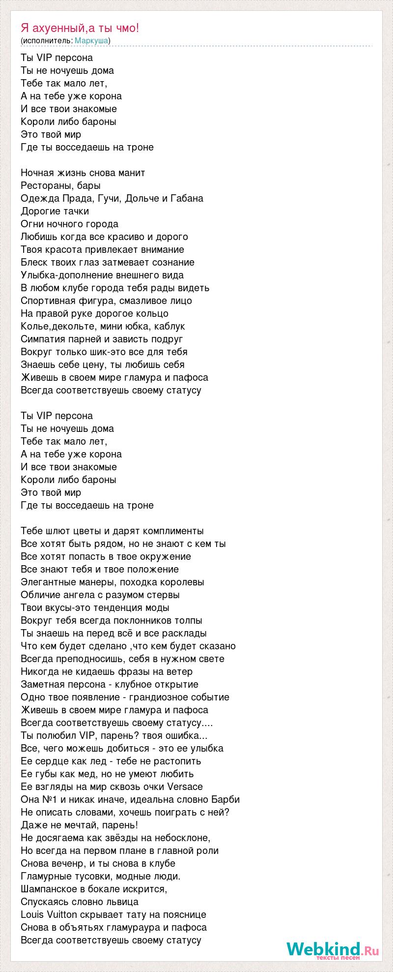 Ты VIP персона Ты не ночуешь дома Тебе так мало лет, А на тебе уже корона И все твои знакомые Короли либо бароны Это твой мир Где ты восседаешь на троне Ночная жизнь снова манит Рестораны, бары Одежда Прада, Гучи, Дольче и Габана Дорогие тачки Огни ночного города Любишь когда все красиво и дорого Твоя красота привлекает внимание Блеск твоих глаз затмевает сознание Улыбка-дополнение внешнего вида В любом клубе города тебя рады видеть Спортивная фигура, смазливое лицо На правой руке дорогое кольцо Колье,декольте, мини юбка, каблук Симпатия парней и зависть подруг Вокруг только шик-это все для тебя Знаешь себе цену, ты любишь себя Живешь в своем мире гламура и пафоса Всегда соответствуешь своему статусу Ты VIP персона Ты не ночуешь дома Тебе так мало лет, А на тебе уже корона И все твои знакомые Короли либо бароны Это твой мир Где ты восседаешь на троне Тебе шлют цветы и дарят комплименты Все хотят быть рядом, но не знают с кем ты Все хотят попасть в твое окружение Все знают тебя и твое положение Элегантные манеры, походка королевы Обличие ангела с разумом стервы Твои вкусы-это тенденция моды Вокруг тебя всегда поклонников толпы Ты знаешь на перед всё и все расклады Что кем будет сделано ,что кем будет сказано Всегда преподносишь, себя в нужном свете Никогда не кидаешь фразы на ветер Заметная персона - клубное открытие Одно твое появление - грандиозное событие Живешь в своем мире гламура и пафоса Всегда соответствуешь своему статусу.... Ты полюбил VIP, парень? твоя ошибка... Все, чего можешь добиться - это ее улыбка Ее сердце как лед - тебе не растопить Ее губы как мед, но не умеют любить Ее взгляды на мир сквозь очки Versace Она №1 и никак иначе, идеальна словно Барби Не описать словами, хочешь поиграть с ней? Даже не мечтай, парень! Не досягаема как звёзды на небосклоне, Но всегда на первом плане в главной роли Снова веченр, и ты снова в клубе Гламурные тусовки, модные люди. Шампанское в бокале искрится, Спускаясь словно львица Louis Vuitton скрывает тату на пояснице Снова в объятьях гламураура и пафоса Всегда соответствуешь своему статусу