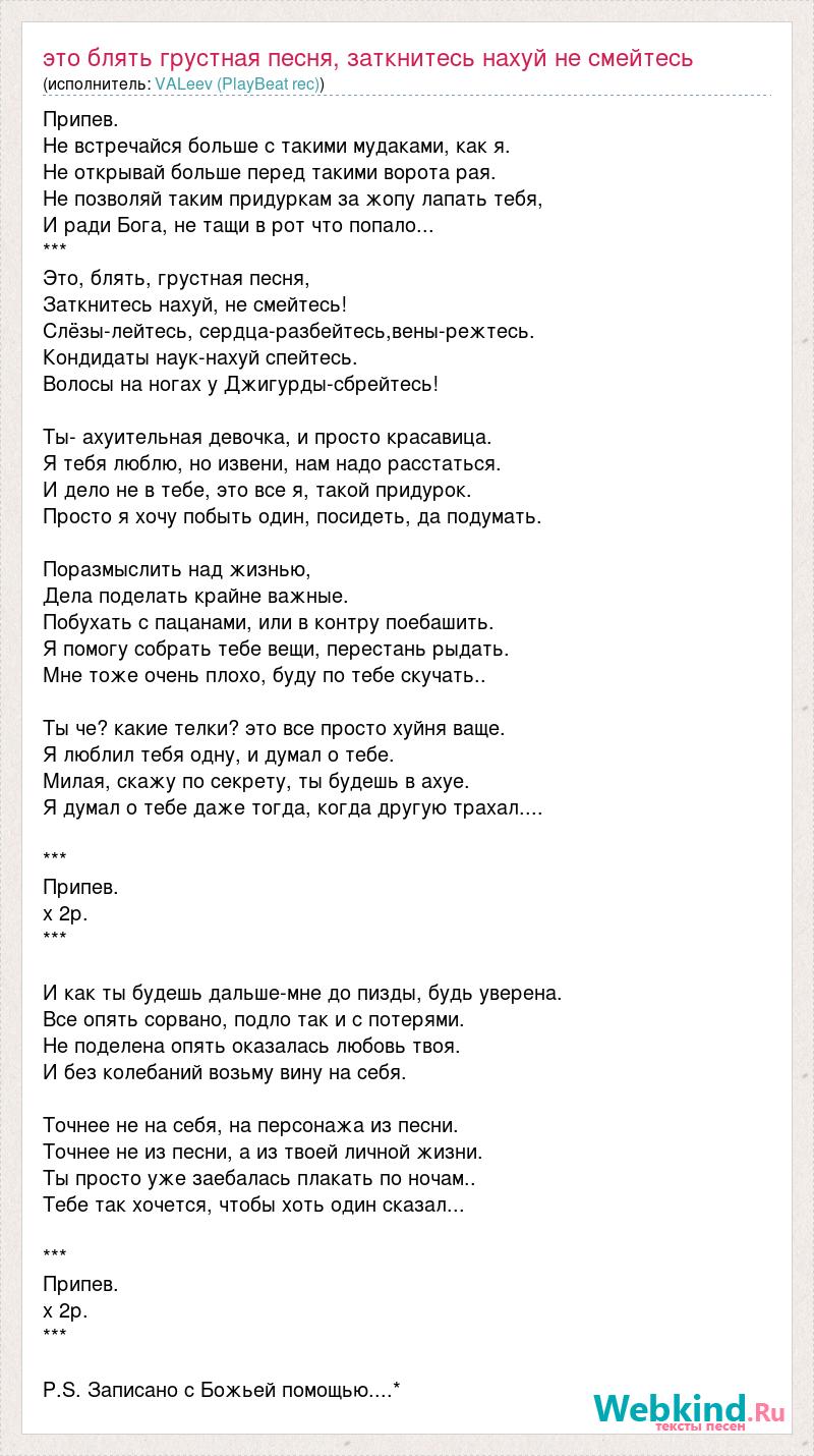 Припев. Не встречайся больше с такими мудаками, как я. Не открывай больше перед такими ворота рая. Не позволяй таким придуркам за жопу лапать тебя, И ради Бога, не тащи в рот что попало... *** Это, блять, грустная песня, Заткнитесь нахуй, не смейтесь! Слёзы-лейтесь, сердца-разбейтесь,вены-режтесь. Кондидаты наук-нахуй спейтесь. Волосы на ногах у Джигурды-сбрейтесь! Ты- ахуительная девочка, и просто красавица. Я тебя люблю, но извени, нам надо расстаться. И дело не в тебе, это все я, такой придурок. Просто я хочу побыть один, посидеть, да подумать. Поразмыслить над жизнью, Дела поделать крайне важные. Побухать с пацанами, или в контру поебашить. Я помогу собрать тебе вещи, перестань рыдать. Мне тоже очень плохо, буду по тебе скучать.. Ты че? какие телки? это все просто хуйня ваще. Я люблил тебя одну, и думал о тебе. Милая, скажу по секрету, ты будешь в ахуе. Я думал о тебе даже тогда, когда другую трахал.... *** Припев. х 2р. *** И как ты будешь дальше-мне до пизды, будь уверена. Все опять сорвано, подло так и с потерями. Не поделена опять оказалась любовь твоя. И без колебаний возьму вину на себя. Точнее не на себя, на персонажа из песни. Точнее не из песни, а из твоей личной жизни. Ты просто уже заебалась плакать по ночам.. Тебе так хочется, чтобы хоть один сказал... *** Припев. х 2р. *** Р.S. Записано с Божьей помощью....*