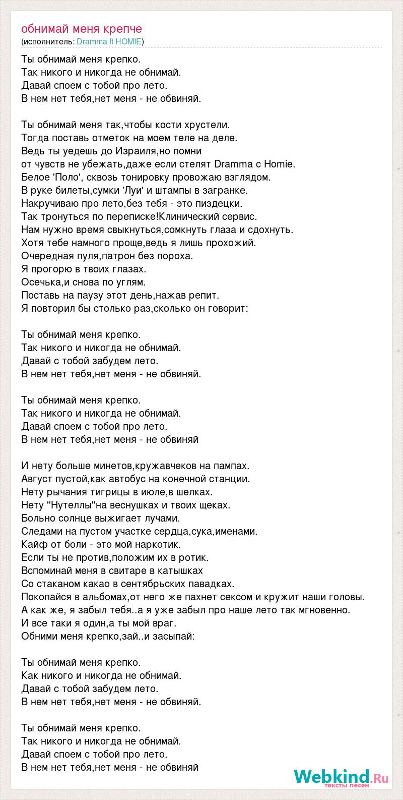 Ты обнимай меня крепко. Так никого и никогда не обнимай. Давай споем с тобой про лето. В нем нет тебя,нет меня - не обвиняй. Ты обнимай меня так,чтобы кости хрустели. Тогда поставь отметок на моем теле на деле. Ведь ты уедешь до Израиля,но помни от чувств не убежать,даже если стелят Dramma с Homie. Белое 'Поло', сквозь тонировку провожаю взглядом. В руке билеты,сумки 'Луи' и штампы в загранке. Накручиваю про лето,без тебя - это пиздецки. Так тронуться по переписке!Клинический сервис. Нам нужно время свыкнуться,сомкнуть глаза и сдохнуть. Хотя тебе намного проще,ведь я лишь прохожий. Очередная пуля,патрон без пороха. Я прогорю в твоих глазах. Осечька,и снова по углям. Поставь на паузу этот день,нажав репит. Я повторил бы столько раз,сколько он говорит: Ты обнимай меня крепко. Так никого и никогда не обнимай. Давай с тобой забудем лето. В нем нет тебя,нет меня - не обвиняй. Ты обнимай меня крепко. Так никого и никогда не обнимай. Давай споем с тобой про лето. В нем нет тебя,нет меня - не обвиняй И нету больше минетов,кружавчеков на пампах. Август пустой,как автобус на конечной станции. Нету рычания тигрицы в июле,в шелках. Нету ''Нутеллы''на веснушках и твоих щеках. Больно солнце выжигает лучами. Следами на пустом участке сердца,сука,именами. Кайф от боли - это мой наркотик. Если ты не против,положим их в ротик. Вспоминай меня в свитаре в катышках Со стаканом какао в сентябрьских павадках. Покопайся в альбомах,от него же пахнет сексом и кружит наши головы. А как же, я забыл тебя..а я уже забыл про наше лето так мгновенно. И все таки я один,а ты мой враг. Обними меня крепко,зай..и засыпай: Ты обнимай меня крепко. Как никого и никогда не обнимай. Давай с тобой забудем лето. В нем нет тебя,нет меня - не обвиняй. Ты обнимай меня крепко. Так никого и никогда не обнимай. Давай споем с тобой про лето. В нем нет тебя,нет меня - не обвиняй
