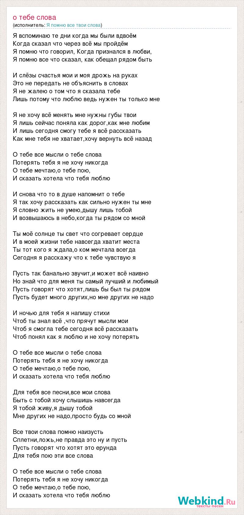 Я вспоминаю те дни когда мы были вдвоём Когда сказал что через всё мы пройдём Я помню что говорил, Когда признался в любви, Я помню все что сказал, как обещал рядом быть И слёзы счастья мои и моя дрожь на руках Это не передать не объяснить в словах Я не жалею о том что я сказала тебе Лишь потому что люблю ведь нужен ты только мне Я не хочу всё менять мне нужны губы твои Я лишь сейчас поняла как дорог,как мне любим И лишь сегодня смогу тебе я всё рассказать Как мне тебя не хватает,хочу вернуть всё назад О тебе все мысли о тебе слова Потерять тебя я не хочу никогда О тебе мечтаю,о тебе пою, И сказать хотела что тебя люблю И снова что то в душе напомнит о тебе Я так хочу рассказать как сильно нужен ты мне Я словно жить не умею,дышу лишь тобой И возвышаюсь в небо,когда ты рядом со мной Ты моё солнце ты свет что согревает сердце И в моей жизни тебе навсегда хватит места Ты тот кого я ждала,о ком мечтала всегда Сегодня я расскажу что к тебе чувствую я Пусть так банально звучит,и может всё наивно Но знай что для меня ты самый лучший и любимый Пусть говорят что хотят,лишь бы был ты рядом Пусть будет много других,но мне других не надо И ночью для тебя я напишу стихи Чтоб ты знал всё ,что прячут мысли мои Чтоб я смогла тебе сегодня всё рассказать Чтоб понял как я люблю и не хочу потерять О тебе все мысли о тебе слова Потерять тебя я не хочу никогда О тебе мечтаю,о тебе пою, И сказать хотела что тебя люблю Для тебя все песни,все мои слова Быть с тобой хочу слышишь навсегда Я тобой живу,я дышу тобой Мне других не надо,просто будь со мной Все твои слова помню наизусть Сплетни,ложь,не правда это ну и пусть Пусть говорят что хотят это ерунда Для тебя пою эти все слова О тебе все мысли о тебе слова Потерять тебя я не хочу никогда О тебе мечтаю,о тебе пою, И сказать хотела что тебя люблю