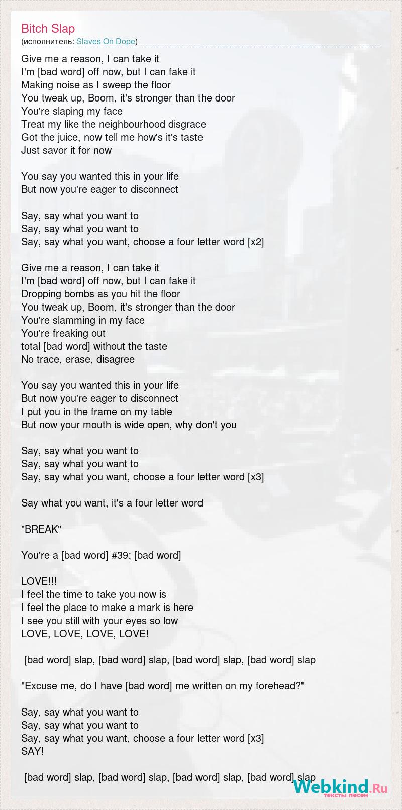 Give me a reason, I can take it I'm [bad word] off now, but I can fake it Making noise as I sweep the floor You tweak up, Boom, it's stronger than the door You're slaping my face Treat my like the neighbourhood disgrace Got the juice, now tell me how's it's taste Just savor it for now You say you wanted this in your life But now you're eager to disconnect Say, say what you want to Say, say what you want to Say, say what you want, choose a four letter word [x2] Give me a reason, I can take it I'm [bad word] off now, but I can fake it Dropping bombs as you hit the floor You tweak up, Boom, it's stronger than the door You're slamming in my face You're freaking out total [bad word] without the taste No trace, erase, disagree You say you wanted this in your life But now you're eager to disconnect I put you in the frame on my table But now your mouth is wide open, why don't you Say, say what you want to Say, say what you want to Say, say what you want, choose a four letter word [x3] Say what you want, it's a four letter word "BREAK" You're a [bad word] #39; [bad word] LOVE!!! I feel the time to take you now is I feel the place to make a mark is here I see you still with your eyes so low LOVE, LOVE, LOVE, LOVE! [bad word] slap, [bad word] slap, [bad word] slap, [bad word] slap "Excuse me, do I have [bad word] me written on my forehead?" Say, say what you want to Say, say what you want to Say, say what you want, choose a four letter word [x3] SAY! [bad word] slap, [bad word] slap, [bad word] slap, [bad word] slap