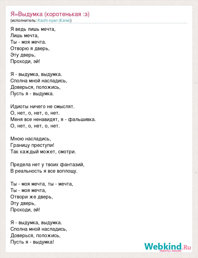 Я ведь лишь мечта, Лишь мечта, Ты - моя мечта. Отворю я дверь, Эту дверь, Проходи, эй! Я - выдумка, выдумка. Сполна мной насладись, Доверься, положись, Пусть я - выдумка. Идиоты ничего не смыслят. О, нет, о, нет, о, нет. Меня все ненавидят, я - фальшивка. О, нет, о, нет, о, нет. Мною насладись, Границу преступи! Так каждый может, смотри. Предела нет у твоих фантазий, В реальность я все воплощу. Ты - моя мечта, ты - мечта, Ты - моя мечта, Отвори же дверь, Эту дверь, Проходи, эй! Я - выдумка, выдумка. Сполна мной насладись, Доверься, положись, Пусть я - выдумка!