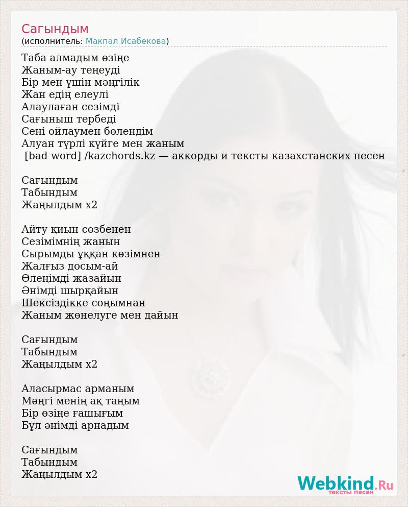 Таба алмадым өзіңе Жаным-ау теңеуді Бір мен үшін мәңгілік Жан едің елеулі Алаулаған сезімді Сағыныш тербеді Сені ойлаумен бөлендім Алуан түрлі күйге мен жаным [bad word] /kazchords.kz — аккорды и тексты казахстанских песен Сағындым Табындым Жаңылдым x2 Айту қиын сөзбенен Сезімімнің жанын Сырымды ұққан көзімнен Жалғыз досым-ай Өлеңімді жазайын Әнімді шырқайын Шексіздікке соңымнан Жаным жөнелуге мен дайын Сағындым Табындым Жаңылдым x2 Аласырмас арманым Мәңгі менің ақ таңым Бір өзіңе ғашығым Бұл әнімді арнадым Сағындым Табындым Жаңылдым x2