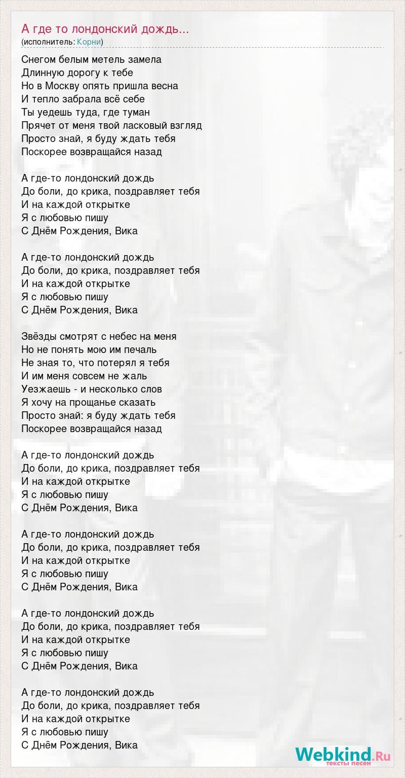Снегом белым метель замела Длинную дорогу к тебе Но в Москву опять пришла весна И тепло забрала всё себе Ты уедешь туда, где туман Прячет от меня твой ласковый взгляд Просто знай, я буду ждать тебя Поскорее возвращайся назад А где-то лондонский дождь До боли, до крика, поздравляет тебя И на каждой открытке Я с любовью пишу С Днём Рождения, Вика А где-то лондонский дождь До боли, до крика, поздравляет тебя И на каждой открытке Я с любовью пишу С Днём Рождения, Вика Звёзды смотрят с небес на меня Но не понять мою им печаль Не зная то, что потерял я тебя И им меня совсем не жаль Уезжаешь - и несколько слов Я хочу на прощанье сказать Просто знай: я буду ждать тебя Поскорее возвращайся назад А где-то лондонский дождь До боли, до крика, поздравляет тебя И на каждой открытке Я с любовью пишу С Днём Рождения, Вика А где-то лондонский дождь До боли, до крика, поздравляет тебя И на каждой открытке Я с любовью пишу С Днём Рождения, Вика А где-то лондонский дождь До боли, до крика, поздравляет тебя И на каждой открытке Я с любовью пишу С Днём Рождения, Вика А где-то лондонский дождь До боли, до крика, поздравляет тебя И на каждой открытке Я с любовью пишу С Днём Рождения, Вика