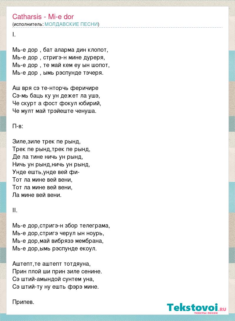 I. Мь-е дор , бат аларма дин клопот, Мь-е дор , стригэ-н мине дуреря, Мь-е дор , те май кем еу ын шопот, Мь-е дор , ымь рэспунде тэчеря. Аш вря сэ те-нторчь феричире Сэ-мь баць ку ун дежет ла ушэ, Че скурт а фост фокул юбирий, Че мулт май трэйеште ченуша. П-в: Зиле,зиле трек пе рынд, Трек пе рынд,трек пе рынд, Де ла тине ничь ун рынд, Ничь ун рынд,ничь ун рынд, Унде ешть,унде вей фи- Тот ла мине вей вени, Тот ла мине вей вени, Ла мине вей вени. II. Мь-е дор,стригэ-н збор телеграма, Мь-е дор,стригэ черул ын ноурь, Мь-е дор,май вибрязэ мембрана, Мь-е дор,ымь рэспунде екоул. Аштепт,те аштепт тотдяуна, Прин плой ши прин зиле сенине. Сэ штий-амындой сунтем уна, Сэ штий-ту ну ешть фэрэ мине. Припев.