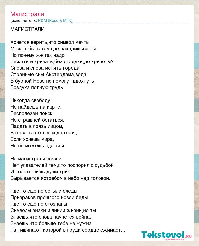МАГИСТРАЛИ Хочется верить,что символ мечты Может быть там,где находишься ты, Но почему же так надо Бежать и кричать,без оглядки,до хрипоты? Снова и снова менять города, Странные сны Амстердама,вода В бурной Неве не помогут вдохнуть Воздуха полную грудь Никогда свободу Не найдешь на карте, Бесполезен поиск, Но страшней остаться, Падать в грязь лицом, Вставать с колен и драться, Если хочешь мира, Но не можешь сдаться На магистрали жизни Нет указателей тем,кто поспорил с судьбой И только лишь души крик Вырывается ястребом в небо над головой. Где то еще не остыли следы Призраков прошлого новой беды Где то еще не опознаны Символы,знаки и линии жизни,но ты Знаешь,что снова начнется война, Знаешь,что больше тебе не нужна Та тишина,от которой в груди сердце сжимает...