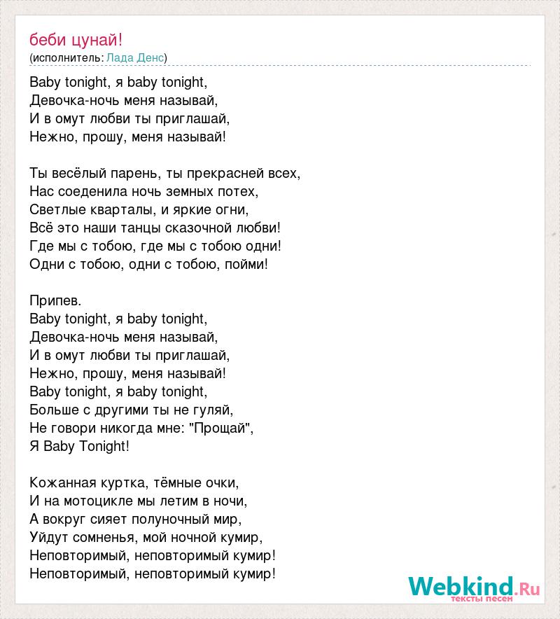 Baby tonight, я baby tonight, Девочка-ночь меня называй, И в омут любви ты приглашай, Нежно, прошу, меня называй! Ты весёлый парень, ты прекрасней всех, Нас соеденила ночь земных потех, Светлые кварталы, и яркие огни, Всё это наши танцы сказочной любви! Где мы с тобою, где мы с тобою одни! Одни с тобою, одни с тобою, пойми! Припев. Baby tonight, я baby tonight, Девочка-ночь меня называй, И в омут любви ты приглашай, Нежно, прошу, меня называй! Baby tonight, я baby tonight, Больше с другими ты не гуляй, Не говори никогда мне: "Прощай", Я Baby Tonight! Кожанная куртка, тёмные очки, И на мотоцикле мы летим в ночи, А вокруг сияет полуночный мир, Уйдут сомненья, мой ночной кумир, Неповторимый, неповторимый кумир! Неповторимый, неповторимый кумир!