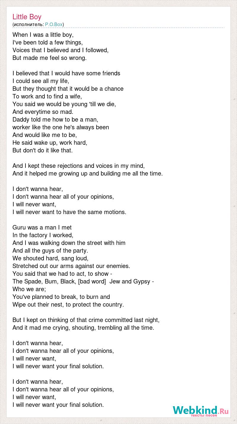 When I was a little boy, I've been told a few things, Voices that I believed and I followed, But made me feel so wrong. I believed that I would have some friends I could see all my life, But they thought that it would be a chance To work and to find a wife, You said we would be young 'till we die, And everytime so mad. Daddy told me how to be a man, worker like the one he's always been And would like me to be, He said wake up, work hard, But don't do it like that. And I kept these rejections and voices in my mind, And it helped me growing up and building me all the time. I don't wanna hear, I don't wanna hear all of your opinions, I will never want, I will never want to have the same motions. Guru was a man I met In the factory I worked, And I was walking down the street with him And all the guys of the party. We shouted hard, sang loud, Stretched out our arms against our enemies. You said that we had to act, to show - The Spade, Bum, Black, [bad word] Jew and Gypsy - Who we are; You've planned to break, to burn and Wipe out their nest, to protect the country. But I kept on thinking of that crime committed last night, And it mad me crying, shouting, trembling all the time. I don't wanna hear, I don't wanna hear all of your opinions, I will never want, I will never want your final solution. I don't wanna hear, I don't wanna hear all of your opinions, I will never want, I will never want your final solution.