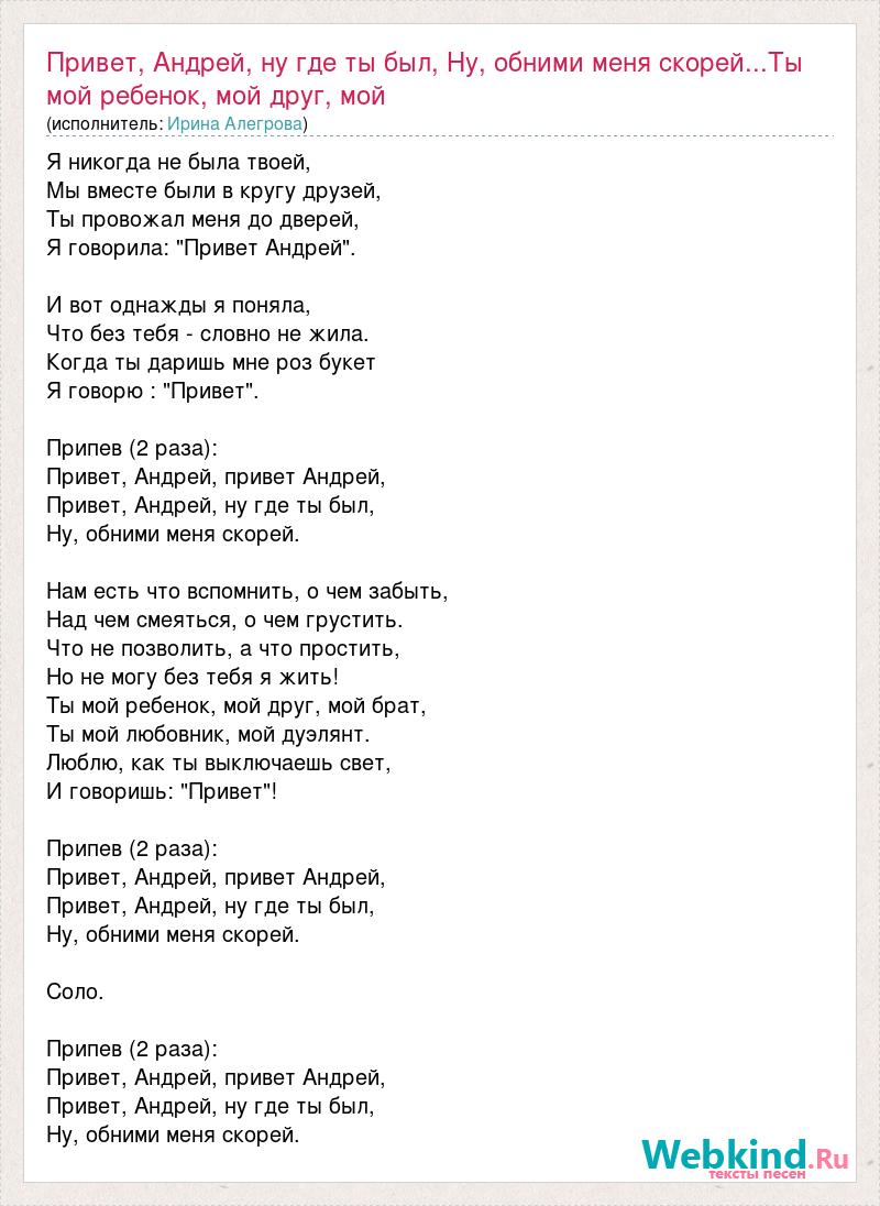Я никогда не была твоей, Мы вместе были в кругу друзей, Ты провожал меня до дверей, Я говорила: "Привет Андрей". И вот однажды я поняла, Что без тебя - словно не жила. Когда ты даришь мне роз букет Я говорю : "Привет". Припев (2 раза): Привет, Андрей, привет Андрей, Привет, Андрей, ну где ты был, Ну, обними меня скорей. Нам есть что вспомнить, о чем забыть, Над чем смеяться, о чем грустить. Что не позволить, а что простить, Но не могу без тебя я жить! Ты мой ребенок, мой друг, мой брат, Ты мой любовник, мой дуэлянт. Люблю, как ты выключаешь свет, И говоришь: "Привет"! Припев (2 раза): Привет, Андрей, привет Андрей, Привет, Андрей, ну где ты был, Ну, обними меня скорей. Соло. Припев (2 раза): Привет, Андрей, привет Андрей, Привет, Андрей, ну где ты был, Ну, обними меня скорей.