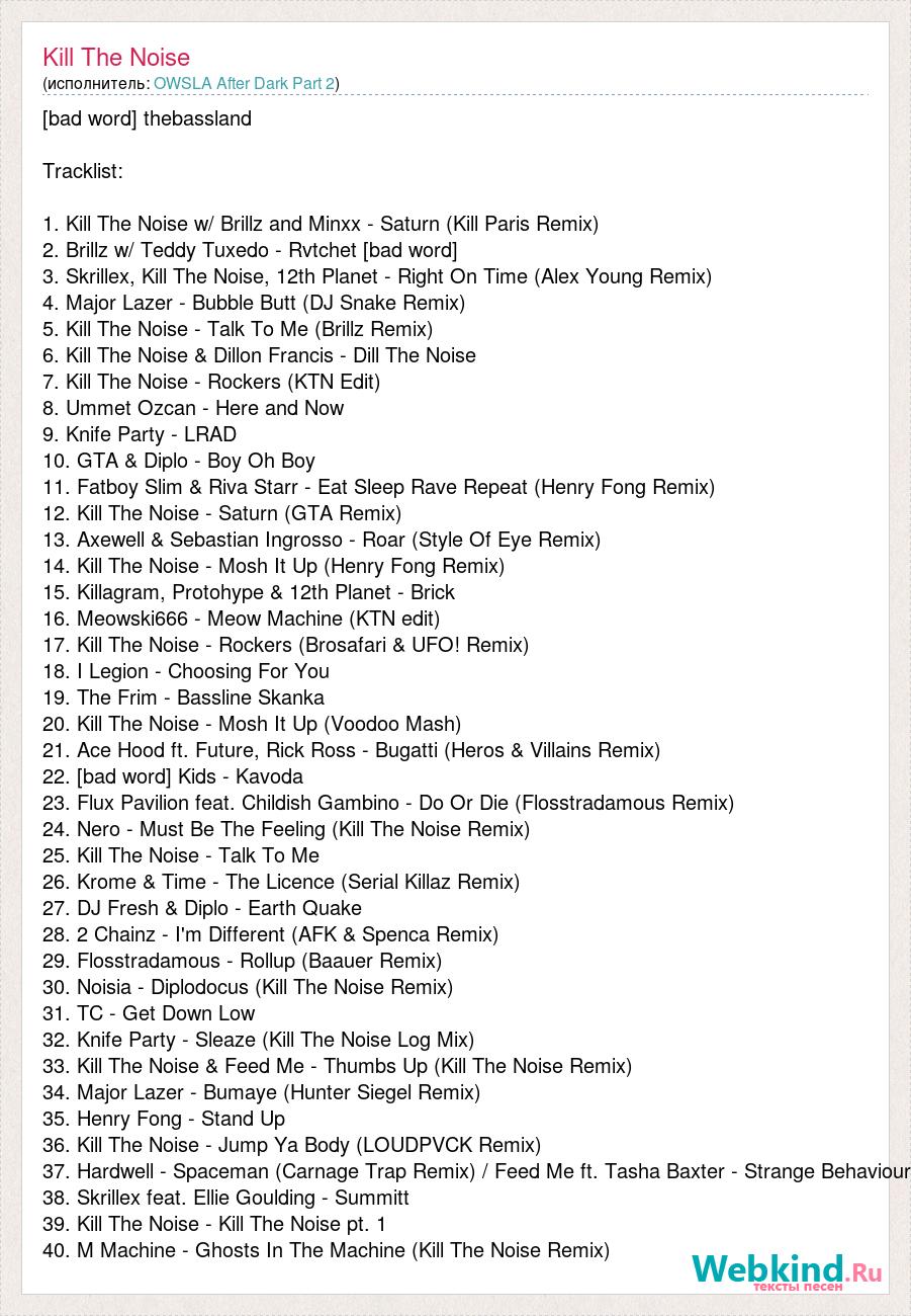 [bad word] thebassland Tracklist: 1. Kill The Noise w/ Brillz and Minxx - Saturn (Kill Paris Remix) 2. Brillz w/ Teddy Tuxedo - Rvtchet [bad word] 3. Skrillex, Kill The Noise, 12th Planet - Right On Time (Alex Young Remix) 4. Major Lazer - Bubble Butt (DJ Snake Remix) 5. Kill The Noise - Talk To Me (Brillz Remix) 6. Kill The Noise & Dillon Francis - Dill The Noise 7. Kill The Noise - Rockers (KTN Edit) 8. Ummet Ozcan - Here and Now 9. Knife Party - LRAD 10. GTA & Diplo - Boy Oh Boy 11. Fatboy Slim & Riva Starr - Eat Sleep Rave Repeat (Henry Fong Remix) 12. Kill The Noise - Saturn (GTA Remix) 13. Axewell & Sebastian Ingrosso - Roar (Style Of Eye Remix) 14. Kill The Noise - Mosh It Up (Henry Fong Remix) 15. Killagram, Protohype & 12th Planet - Brick 16. Meowski666 - Meow Machine (KTN edit) 17. Kill The Noise - Rockers (Brosafari & UFO! Remix) 18. I Legion - Choosing For You 19. The Frim - Bassline Skanka 20. Kill The Noise - Mosh It Up (Voodoo Mash) 21. Ace Hood ft. Future, Rick Ross - Bugatti (Heros & Villains Remix) 22. [bad word] Kids - Kavoda 23. Flux Pavilion feat. Childish Gambino - Do Or Die (Flosstradamous Remix) 24. Nero - Must Be The Feeling (Kill The Noise Remix) 25. Kill The Noise - Talk To Me 26. Krome & Time - The Licence (Serial Killaz Remix) 27. DJ Fresh & Diplo - Earth Quake 28. 2 Chainz - I'm Different (AFK & Spenca Remix) 29. Flosstradamous - Rollup (Baauer Remix) 30. Noisia - Diplodocus (Kill The Noise Remix) 31. TC - Get Down Low 32. Knife Party - Sleaze (Kill The Noise Log Mix) 33. Kill The Noise & Feed Me - Thumbs Up (Kill The Noise Remix) 34. Major Lazer - Bumaye (Hunter Siegel Remix) 35. Henry Fong - Stand Up 36. Kill The Noise - Jump Ya Body (LOUDPVCK Remix) 37. Hardwell - Spaceman (Carnage Trap Remix) / Feed Me ft. Tasha Baxter - Strange Behaviour 38. Skrillex feat. Ellie Goulding - Summitt 39. Kill The Noise - Kill The Noise pt. 1 40. M Machine - Ghosts In The Machine (Kill The Noise Remix)