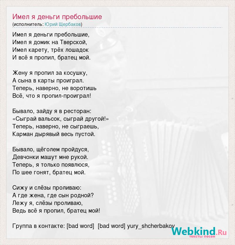 Имел я деньги пребольшие, Имел я домик на Тверской, Имел карету, трёх лошадок И всё я пропил, братец мой. Жену я пропил за косушку, А сына в карты проиграл. Теперь, наверно, не воротишь Всё, что я пропил-проиграл! Бывало, зайду я в ресторан: «Сыграй вальсок, сыграй другой!» Теперь, наверно, не сыграешь, Карман дырявый весь пустой. Бывало, щёголем пройдуся, Девчонки машут мне рукой. Теперь, я только появлюся, По шее гонят, братец мой. Сижу и слёзы проливаю: А где жена, где сын родной? Лежу я, слёзы проливаю, Ведь всё я пропил, братец мой! Группа в контакте: [bad word] [bad word] yury_shcherbakov