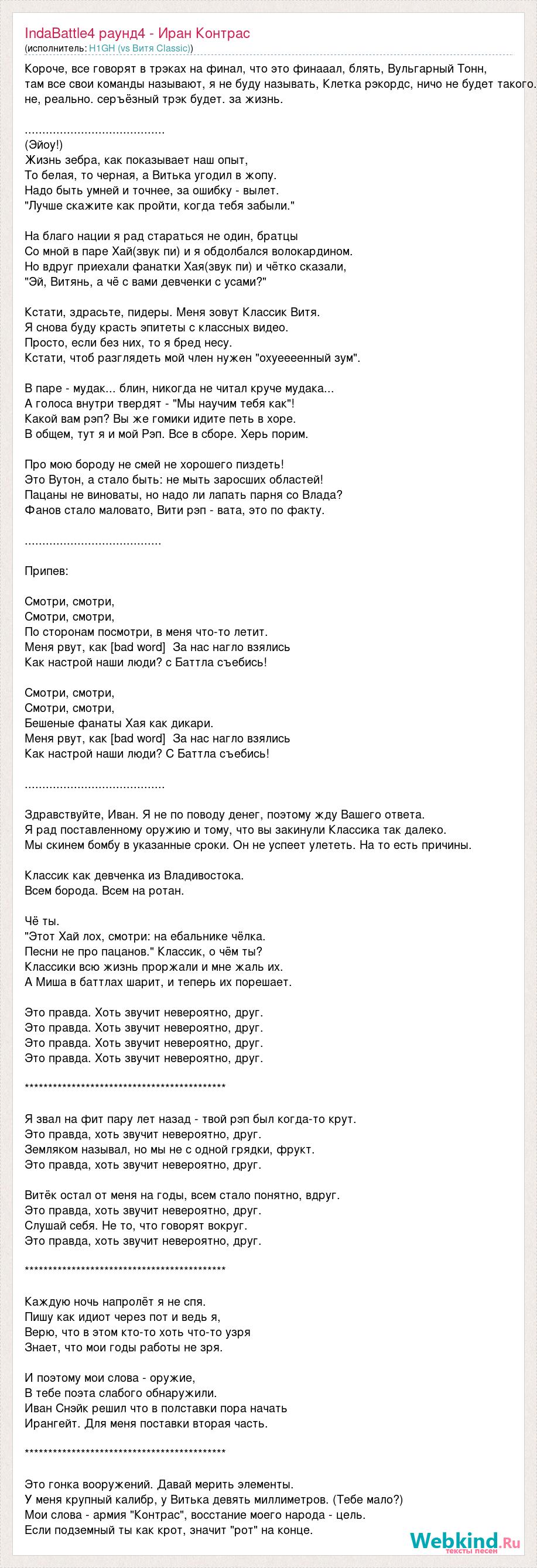 Короче, все говорят в трэках на финал, что это финааал, блять, Вульгарный Тонн, там все свои команды называют, я не буду называть, Клетка рэкордс, ничо не будет такого. не, реально. серъёзный трэк будет. за жизнь. ........................................ (Эйоу!) Жизнь зебра, как показывает наш опыт, То белая, то черная, а Витька угодил в жопу. Надо быть умней и точнее, за ошибку - вылет. "Лучше скажите как пройти, когда тебя забыли." На благо нации я рад стараться не один, братцы Со мной в паре Хай(звук пи) и я обдолбался волокардином. Но вдруг приехали фанатки Хая(звук пи) и чётко сказали, "Эй, Витянь, а чё с вами девченки с усами?" Кстати, здрасьте, пидеры. Меня зовут Классик Витя. Я снова буду красть эпитеты с классных видео. Просто, если без них, то я бред несу. Кстати, чтоб разглядеть мой член нужен "охуеееенный зум". В паре - мудак... блин, никогда не читал круче мудака... А голоса внутри твердят - "Мы научим тебя как"! Какой вам рэп? Вы же гомики идите петь в хоре. В общем, тут я и мой Рэп. Все в сборе. Херь порим. Про мою бороду не смей не хорошего пиздеть! Это Вутон, а стало быть: не мыть заросших областей! Пацаны не виноваты, но надо ли лапать парня со Влада? Фанов стало маловато, Вити рэп - вата, это по факту. ....................................... Припев: Смотри, смотри, Смотри, смотри, По сторонам посмотри, в меня что-то летит. Меня рвут, как [bad word] За нас нагло взялись Как настрой наши люди? с Баттла съебись! Смотри, смотри, Смотри, смотри, Бешеные фанаты Хая как дикари. Меня рвут, как [bad word] За нас нагло взялись Как настрой наши люди? С Баттла съебись! ........................................ Здравствуйте, Иван. Я не по поводу денег, поэтому жду Вашего ответа. Я рад поставленному оружию и тому, что вы закинули Классика так далеко. Мы скинем бомбу в указанные сроки. Он не успеет улететь. На то есть причины. Классик как девченка из Владивостока. Всем борода. Всем на ротан. Чё ты. "Этот Хай лох, смотри: на ебальнике чёлка. Песни не про пацанов." Классик, о чём ты? Классики всю жизнь проржали и мне жаль их. А Миша в баттлах шарит, и теперь их порешает. Это правда. Хоть звучит невероятно, друг. Это правда. Хоть звучит невероятно, друг. Это правда. Хоть звучит невероятно, друг. Это правда. Хоть звучит невероятно, друг. ******************************************* Я звал на фит пару лет назад - твой рэп был когда-то крут. Это правда, хоть звучит невероятно, друг. Земляком называл, но мы не с одной грядки, фрукт. Это правда, хоть звучит невероятно, друг. Витёк остал от меня на годы, всем стало понятно, вдруг. Это правда, хоть звучит невероятно, друг. Слушай себя. Не то, что говорят вокруг. Это правда, хоть звучит невероятно, друг. ******************************************* Каждую ночь напролёт я не спя. Пишу как идиот через пот и ведь я, Верю, что в этом кто-то хоть что-то узря Знает, что мои годы работы не зря. И поэтому мои слова - оружие, В тебе поэта слабого обнаружили. Иван Снэйк решил что в полставки пора начать Ирангейт. Для меня поставки вторая часть. ******************************************* Это гонка вооружений. Давай мерить элементы. У меня крупный калибр, у Витька девять миллиметров. (Тебе мало?) Мои слова - армия "Контрас", восстание моего народа - цель. Если подземный ты как крот, значит "рот" на конце.