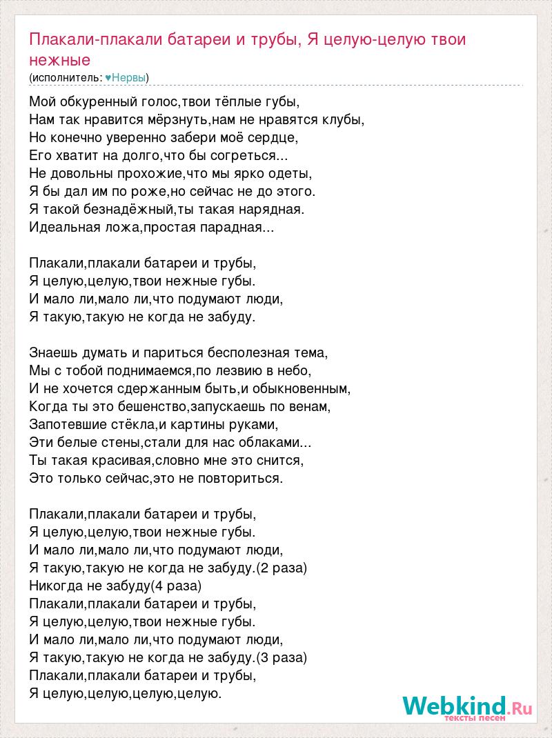 Мой обкуренный голос,твои тёплые губы, Нам так нравится мёрзнуть,нам не нравятся клубы, Но конечно уверенно забери моё сердце, Его хватит на долго,что бы согреться... Не довольны прохожие,что мы ярко одеты, Я бы дал им по роже,но сейчас не до этого. Я такой безнадёжный,ты такая нарядная. Идеальная ложа,простая парадная... Плакали,плакали батареи и трубы, Я целую,целую,твои нежные губы. И мало ли,мало ли,что подумают люди, Я такую,такую не когда не забуду. Знаешь думать и париться бесполезная тема, Мы с тобой поднимаемся,по лезвию в небо, И не хочется сдержанным быть,и обыкновенным, Когда ты это бешенство,запускаешь по венам, Запотевшие стёкла,и картины руками, Эти белые стены,стали для нас облаками... Ты такая красивая,словно мне это снится, Это только сейчас,это не повториться. Плакали,плакали батареи и трубы, Я целую,целую,твои нежные губы. И мало ли,мало ли,что подумают люди, Я такую,такую не когда не забуду.(2 раза) Никогда не забуду(4 раза) Плакали,плакали батареи и трубы, Я целую,целую,твои нежные губы. И мало ли,мало ли,что подумают люди, Я такую,такую не когда не забуду.(3 раза) Плакали,плакали батареи и трубы, Я целую,целую,целую,целую.