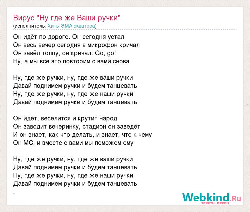 Он идёт по дороге. Он сегодня устал Он весь вечер сегодня в микрофон кричал Он завёл толпу, он кричал: Go, go! Ну, а мы всё это повторим с вами снова Ну, где же ручки, ну, где же ваши ручки Давай поднимем ручки и будем танцевать Ну, где же ручки, ну, где же наши ручки Давай поднимем ручки и будем танцевать Он идёт, веселится и крутит народ Он заводит вечеринку, стадион он заведёт И он знает, как что делать, и знает, что к чему Он MC, и вместе с вами мы поможем ему Ну, где же ручки, ну, где же ваши ручки Давай поднимем ручки и будем танцевать Ну, где же ручки, ну, где же наши ручки Давай поднимем ручки и будем танцевать .