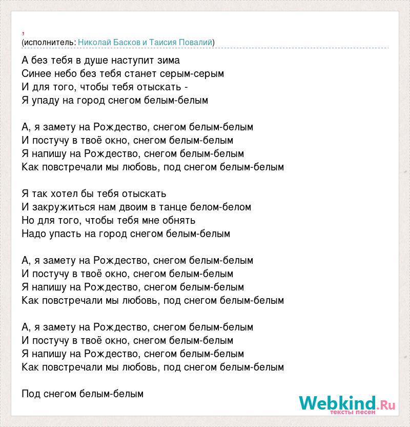 А без тебя в душе наступит зима Синее небо без тебя станет серым-серым И для того, чтобы тебя отыскать - Я упаду на город снегом белым-белым А, я замету на Рождество, снегом белым-белым И постучу в твоё окно, снегом белым-белым Я напишу на Рождество, снегом белым-белым Как повстречали мы любовь, под снегом белым-белым Я так хотел бы тебя отыскать И закружиться нам двоим в танце белом-белом Но для того, чтобы тебя мне обнять Надо упасть на город снегом белым-белым А, я замету на Рождество, снегом белым-белым И постучу в твоё окно, снегом белым-белым Я напишу на Рождество, снегом белым-белым Как повстречали мы любовь, под снегом белым-белым А, я замету на Рождество, снегом белым-белым И постучу в твоё окно, снегом белым-белым Я напишу на Рождество, снегом белым-белым Как повстречали мы любовь, под снегом белым-белым Под снегом белым-белым
