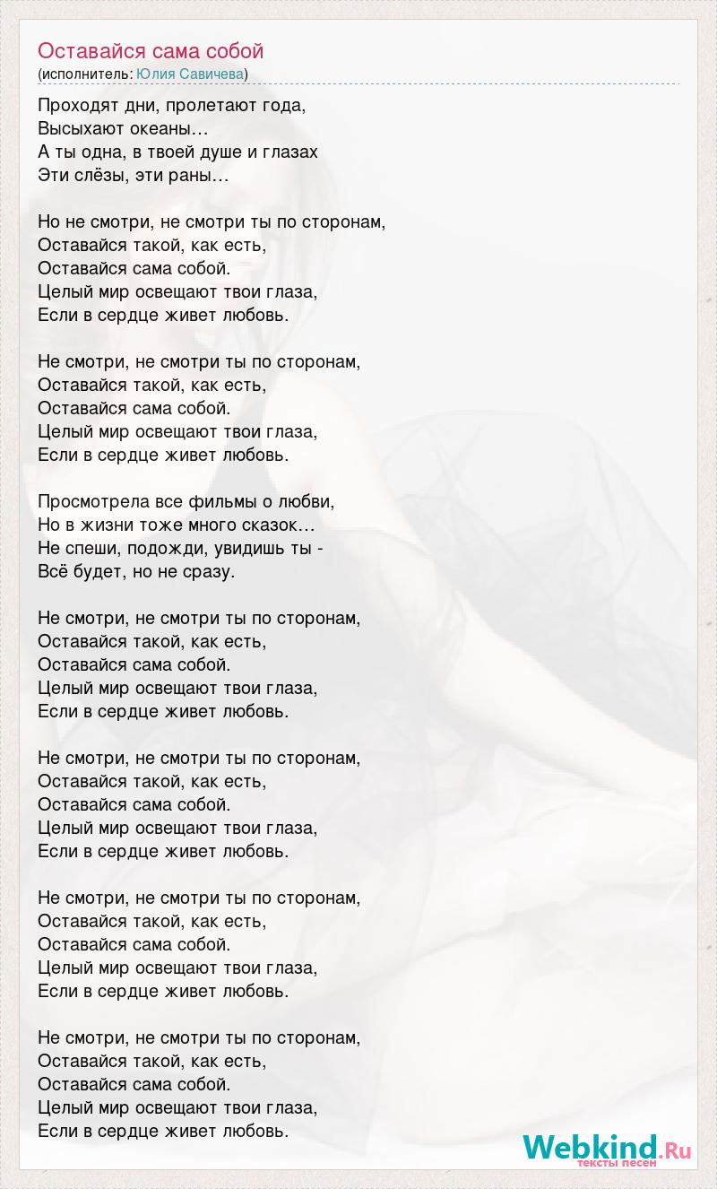 Проходят дни, пролетают года, Высыхают океаны… А ты одна, в твоей душе и глазах Эти слёзы, эти раны… Но не смотри, не смотри ты по сторонам, Оставайся такой, как есть, Оставайся сама собой. Целый мир освещают твои глаза, Если в сердце живет любовь. Не смотри, не смотри ты по сторонам, Оставайся такой, как есть, Оставайся сама собой. Целый мир освещают твои глаза, Если в сердце живет любовь. Просмотрела все фильмы о любви, Но в жизни тоже много сказок… Не спеши, подожди, увидишь ты - Всё будет, но не сразу. Не смотри, не смотри ты по сторонам, Оставайся такой, как есть, Оставайся сама собой. Целый мир освещают твои глаза, Если в сердце живет любовь. Не смотри, не смотри ты по сторонам, Оставайся такой, как есть, Оставайся сама собой. Целый мир освещают твои глаза, Если в сердце живет любовь. Не смотри, не смотри ты по сторонам, Оставайся такой, как есть, Оставайся сама собой. Целый мир освещают твои глаза, Если в сердце живет любовь. Не смотри, не смотри ты по сторонам, Оставайся такой, как есть, Оставайся сама собой. Целый мир освещают твои глаза, Если в сердце живет любовь.