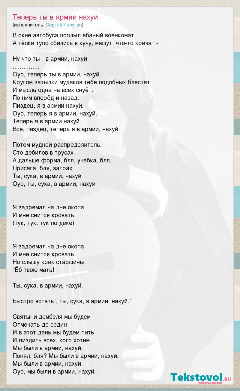В окне автобуса поплыл ебаный военкомат А тёлки тупо сбились в кучу, машут, что-то кричат - Ну что ты - в армии, нахуй ............... Оуо, теперь ты в армии, нахуй Кругом затылки мудаков тебе подобных блестят И мысль одна на всех снуёт: По ним вперёд и назад. Пиздец, я в армии нахуй. Оуо, теперь я в армии, нахуй. Теперь я в армии нахуй. Все, пиздец, теперь я в армии, нахуй. Потом мудной распределитель, Сто дебилов в трусах А дальше форма, бля, учебка, бля, Присяга, бля, затрах Ты, сука, в армии, нахуй Оуо, ты, сука, в армии, нахуй Я задремал на дне окопа И мне снится кровать. (тук, тук, тук по деке) Я задремал на дне окопа И мне снится кровать. Но слышу крик старшины: "Ёб твою мать! Ты, сука, в армии, нахуй. ............... Быстро встать!, ты, сука, в армии, нахуй." Святыни дембеля мы будем Отмечать до седин И в этот день мы будем пить И пиздить всех, кого хотим. Мы были в армии, нахуй. Понял, бля? Мы были в армии, нахуй. Мы были в армии, нахуй Оуо, мы были в армии, нахуй.